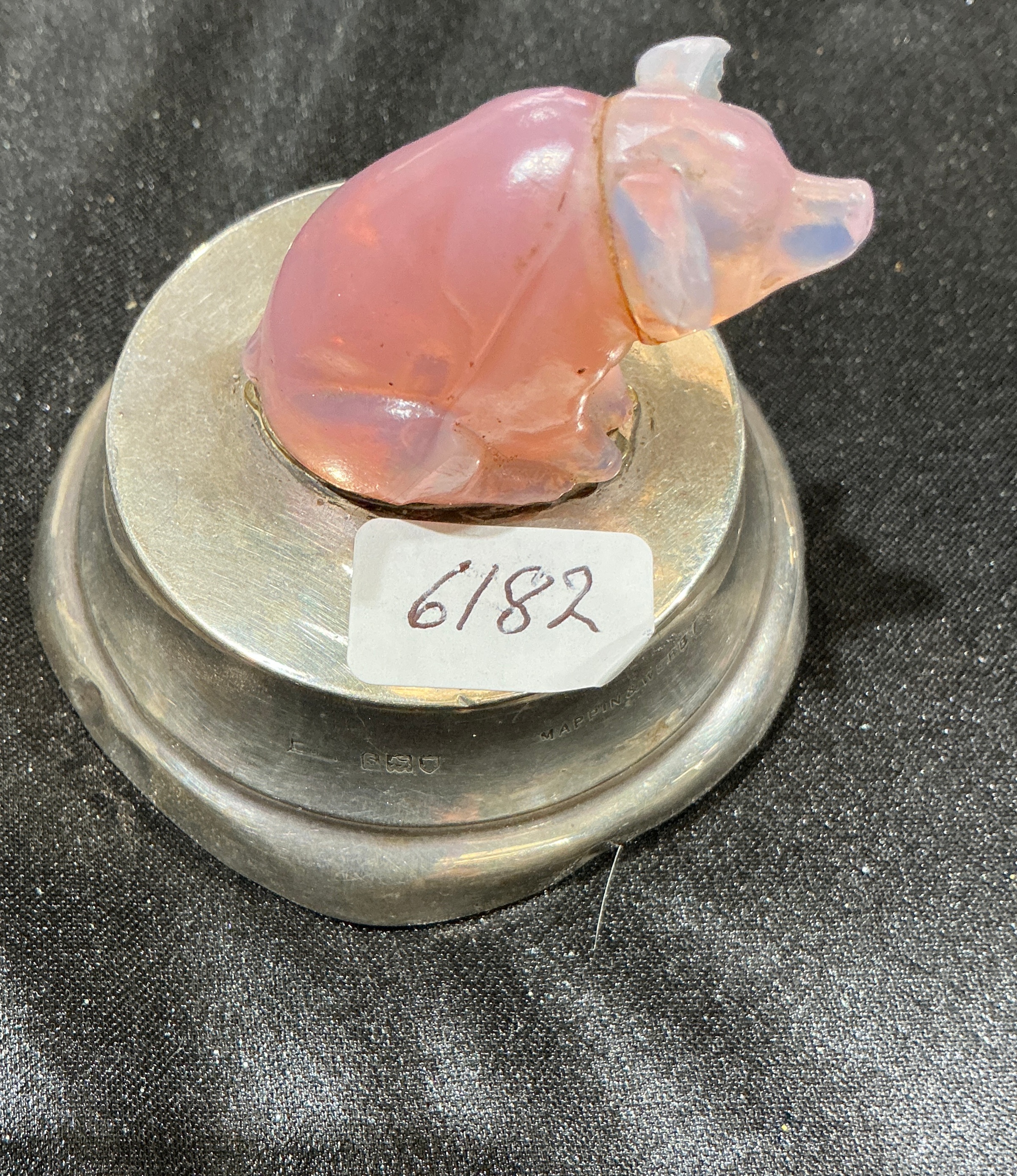 A decorative figurine of a seated pig, carved from opalescent glass. The glass displays characteristic pink tones with blue and white opalescence. The figurine is mounted onto a circular, tiered sterling silver base. The slanted rim of the silver base is stamped with the manufacturer mark Mappin and Webb Ltd. To the right of this text are four hallmarks identifying the base as London sterling silver, including a lion passant, leopard head, and a date letter. A paper sticker with the handwritten number 6182 is attached to the top surface of the silver base.