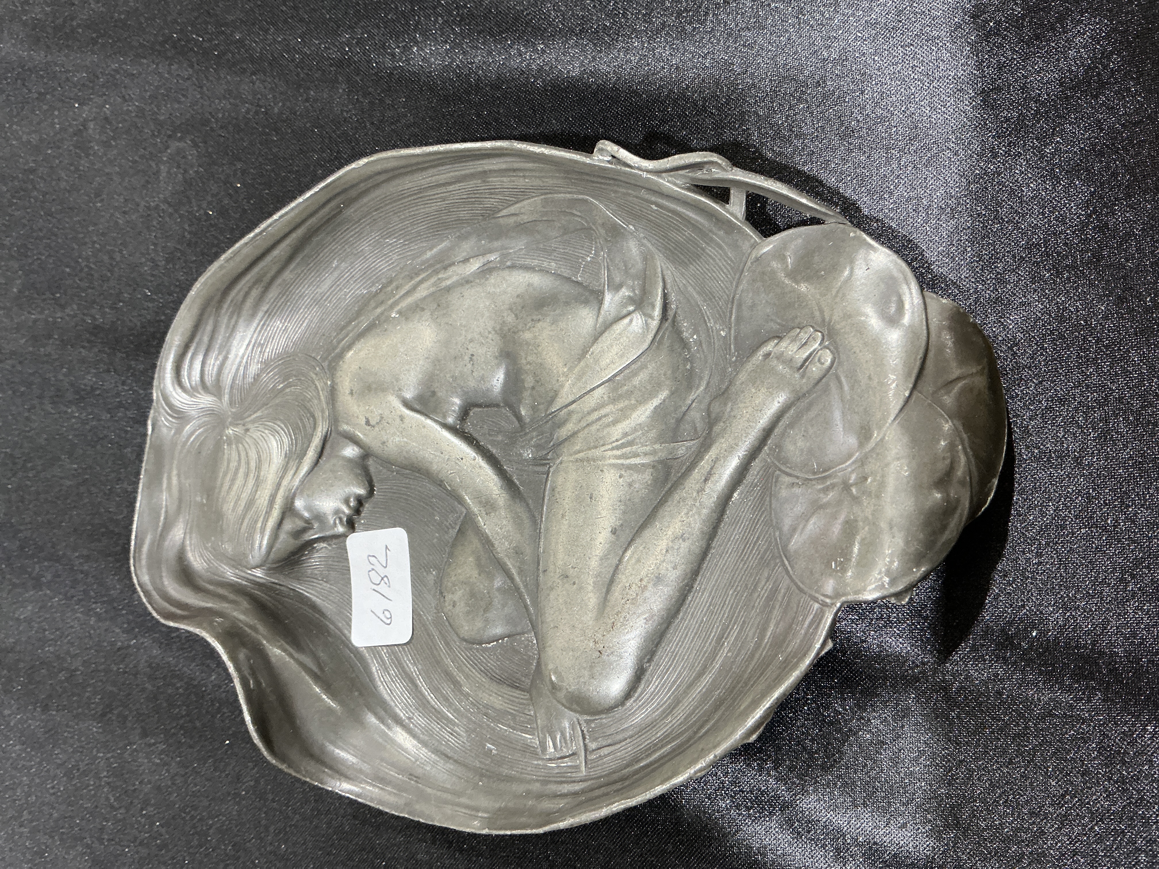 An Art Nouveau pewter card tray . The tray is cast from a grey-toned pewter alloy and features a central relief-cast design of a nude female figure in a reclining pose. Her long, sinuous hair flows outwards to form part of the irregular, organic scalloped rim. To the right of the figure are three overlapping lily pad motifs. The ground of the dish is textured with concentric ripple lines, suggestive of water.