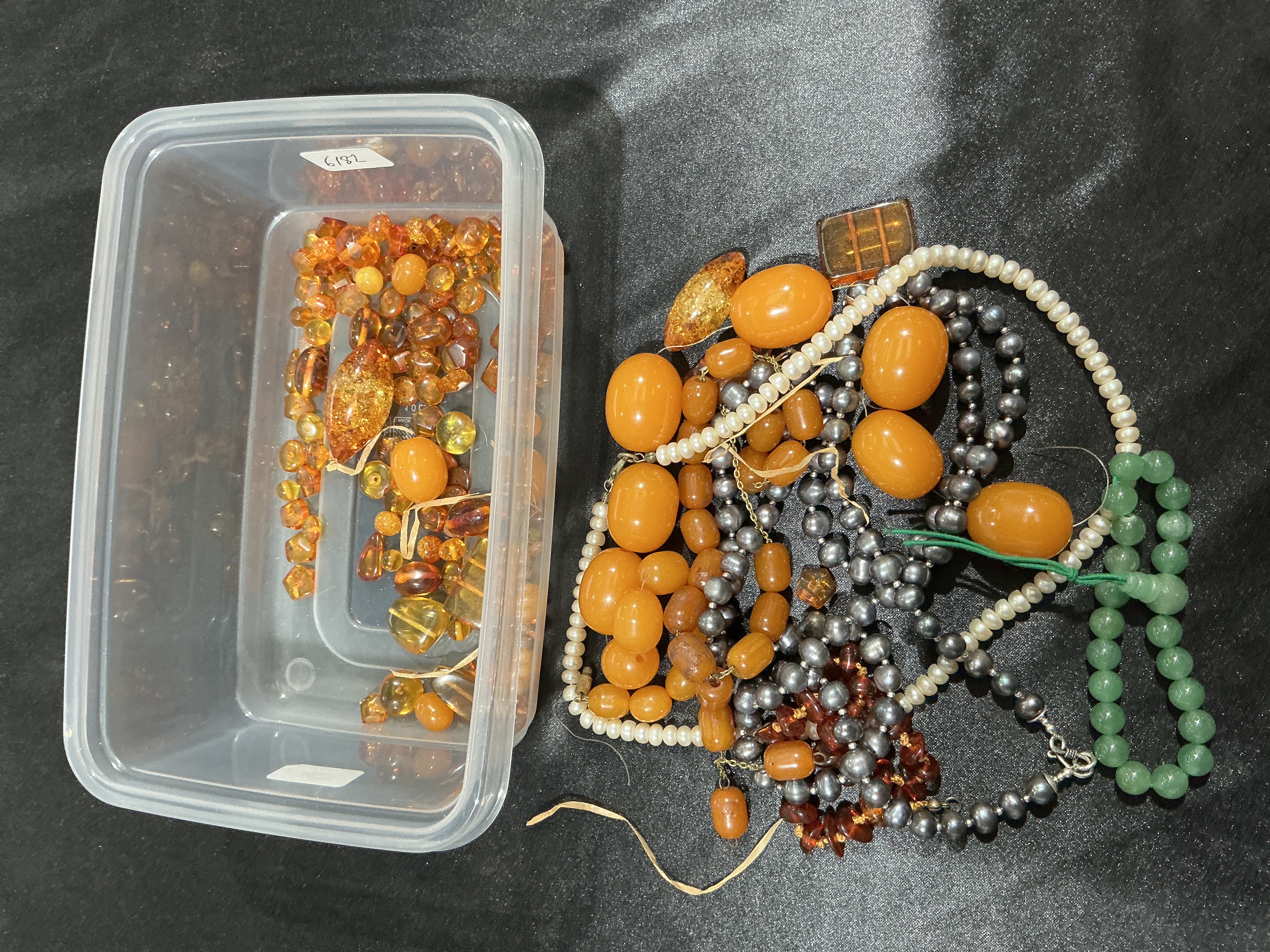 This collection features multiple jewellery items and components, led by a strand of graduated, opaque butterscotch or egg yolk coloured Baltic amber oval beads. The lot includes another necklace of translucent honey-coloured amber beads with internal spangled inclusions, a strand of white cultured pearls, and a strand of iridescent grey cultured pearls. Also present is a strand of round green hardstone beads, which appear to be jadeite or aventurine. An assortment of loose amber-style beads in cherry, honey, and butterscotch tones is contained within a clear plastic box bearing a label marked 6182. The pieces are variously strung on wire and cord; some incorporate silvery-toned metal clasps without visible hallmarks.