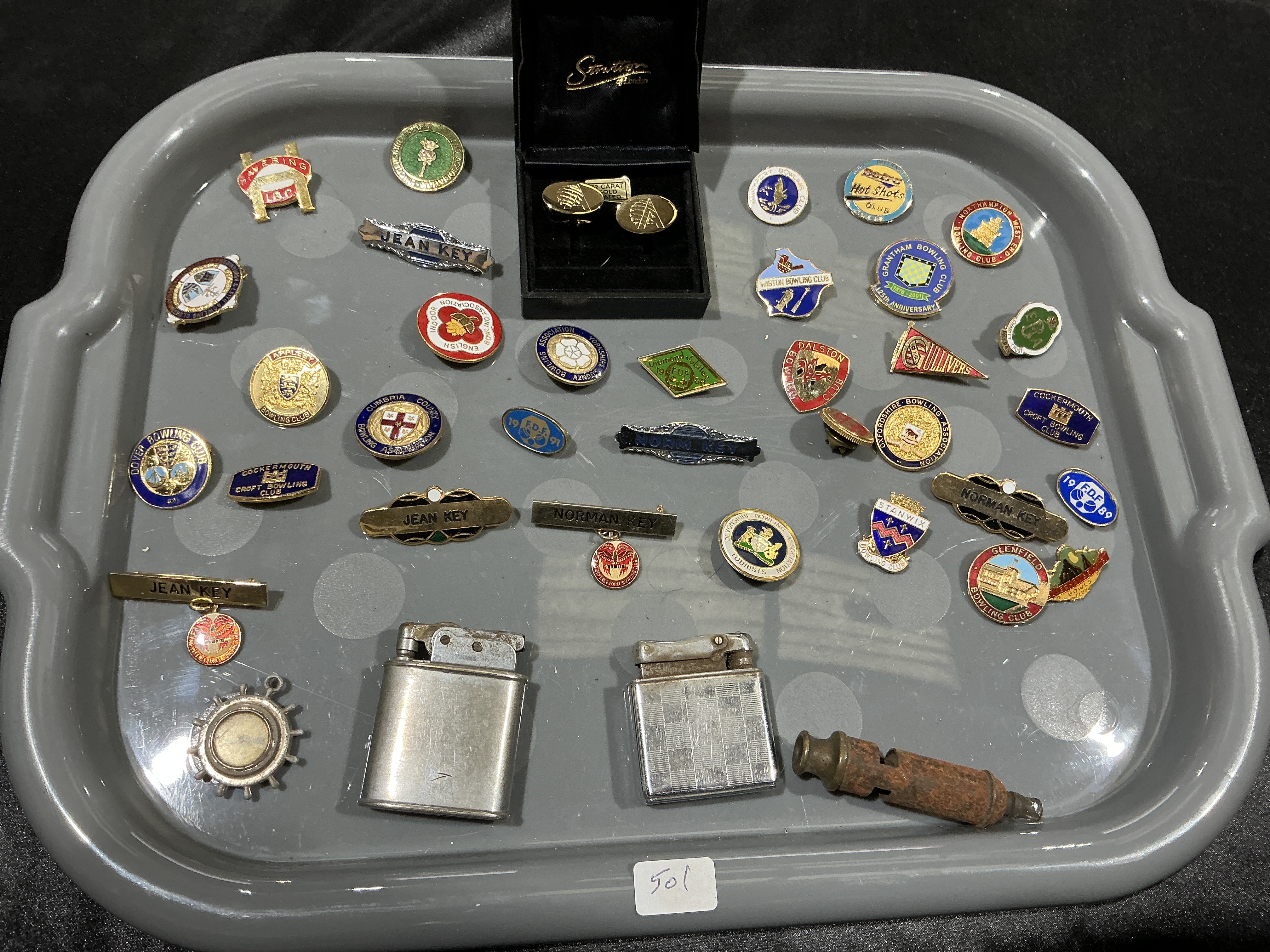 This lot comprises an assortment of items, primarily focused on British lawn bowling club lapel badges and personal accessories. The collection includes numerous enamel pins from various regional clubs and associations, including Cockermouth Croft Bowling Club, Wigton Bowling Club, Dalston, Cumbria County Bowling Association, Grantham Bowling Club (marking the 1876-2001 Anniversary), Glenfield Bowling Club, Hot Shots Club, Stanwix, Dover Bowling Club, Appleby Bowling Club, and Havering L.B.C. One badge is inscribed with F.D.F. 89. Several bar-style name badges are included, engraved with the names Jean Key and Norman Key. The materials consist of gilt and silver-toned base metals with both hard and soft enamel detailing. Also included is a pair of Stratton gold-toned cufflinks with a bird motif, housed in an original black presentation box; one cufflink bears a label stating 22 carat gold layer. The lot further contains two silver-toned pocket lighters, one with a brushed finish and another with a checkered engine-turned pattern. A heavily oxidised metal whistle and a circular metal pendant frame complete the collection.
