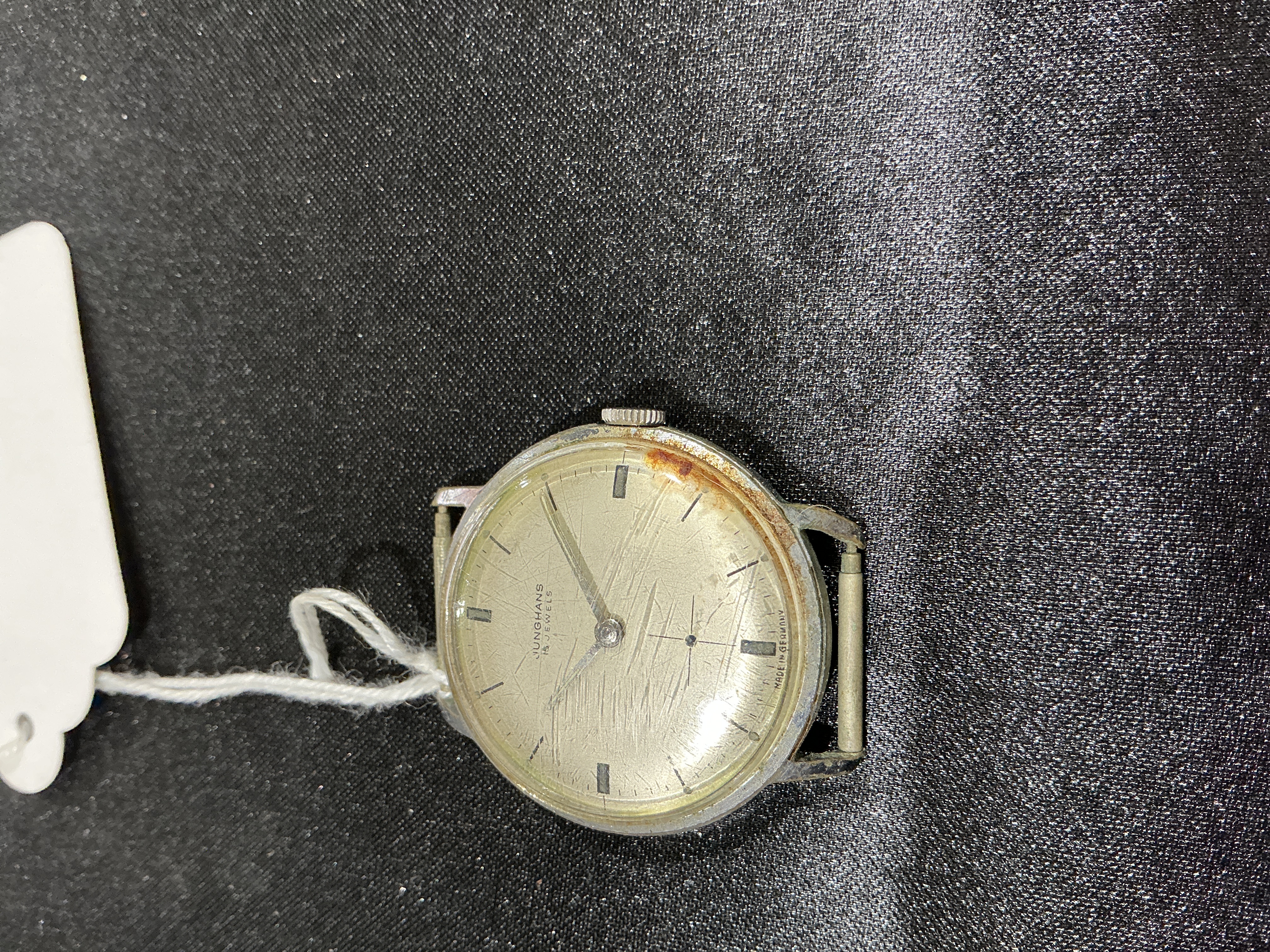 A vintage gents Junghans dress watch. The aged silvered dial features baton hour markers and a crosshair sub-seconds dial at the six o’clock position, signed JUNGHANS 15 JEWELS and MADE IN GERMANY. The watch is powered by a 15-jewel manual wind movement and is housed in a base metal case. The item is sold as a head only with spring bars attached.