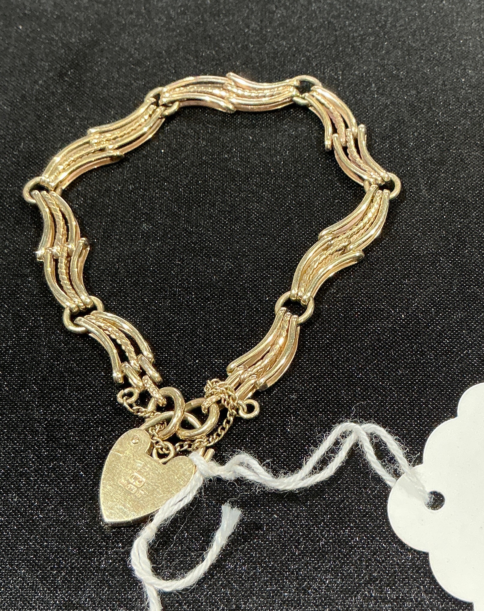 A 9ct yellow gold gate link bracelet composed of triple-row wavy bar links joined by cylindrical pins. The piece includes a fine-link safety chain for added security. A flat, heart-shaped lock is suspended from the terminal link and features stamped marks 9ct gold