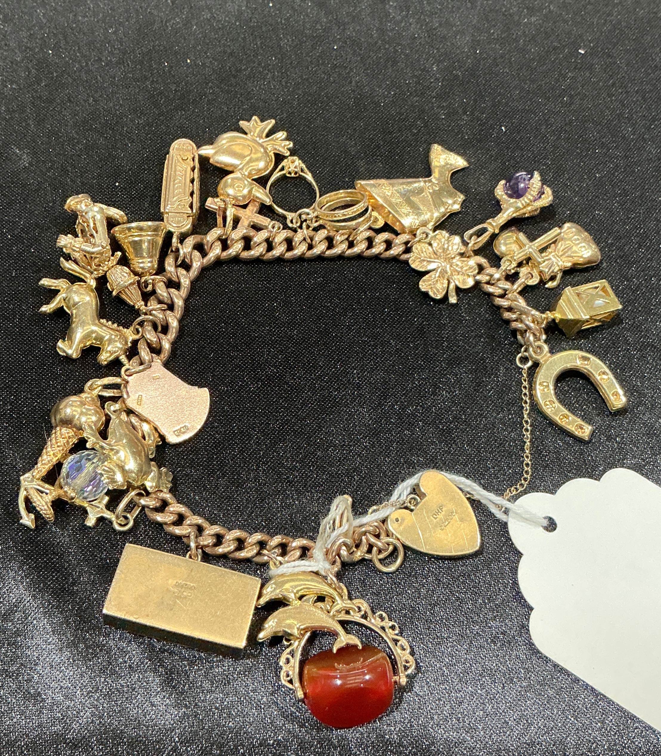 A 9ct yellow gold charm bracelet of curb link construction, featuring an assortment of charms. The collection includes a variety of figurative and decorative subjects such as a horseshoe, a four-leaf clover, a rearing horse, a small dog, a cockerel, and a bell. Gemstone-set charms include a scepter set with a faceted purple stone, possibly amethyst, and a large red cabochon, possibly carnelian, held in a multi-pronged decorative claw setting. Further charms consist of geometric and figurative shapes, some accented with small blue and clear stones. The bracelet is secured by a heart-shaped padlock clasp with an attached safety chain. The reverse of the padlock is stamped with the maker’s mark BHP and a rectangular plaque charm is stamped 375.