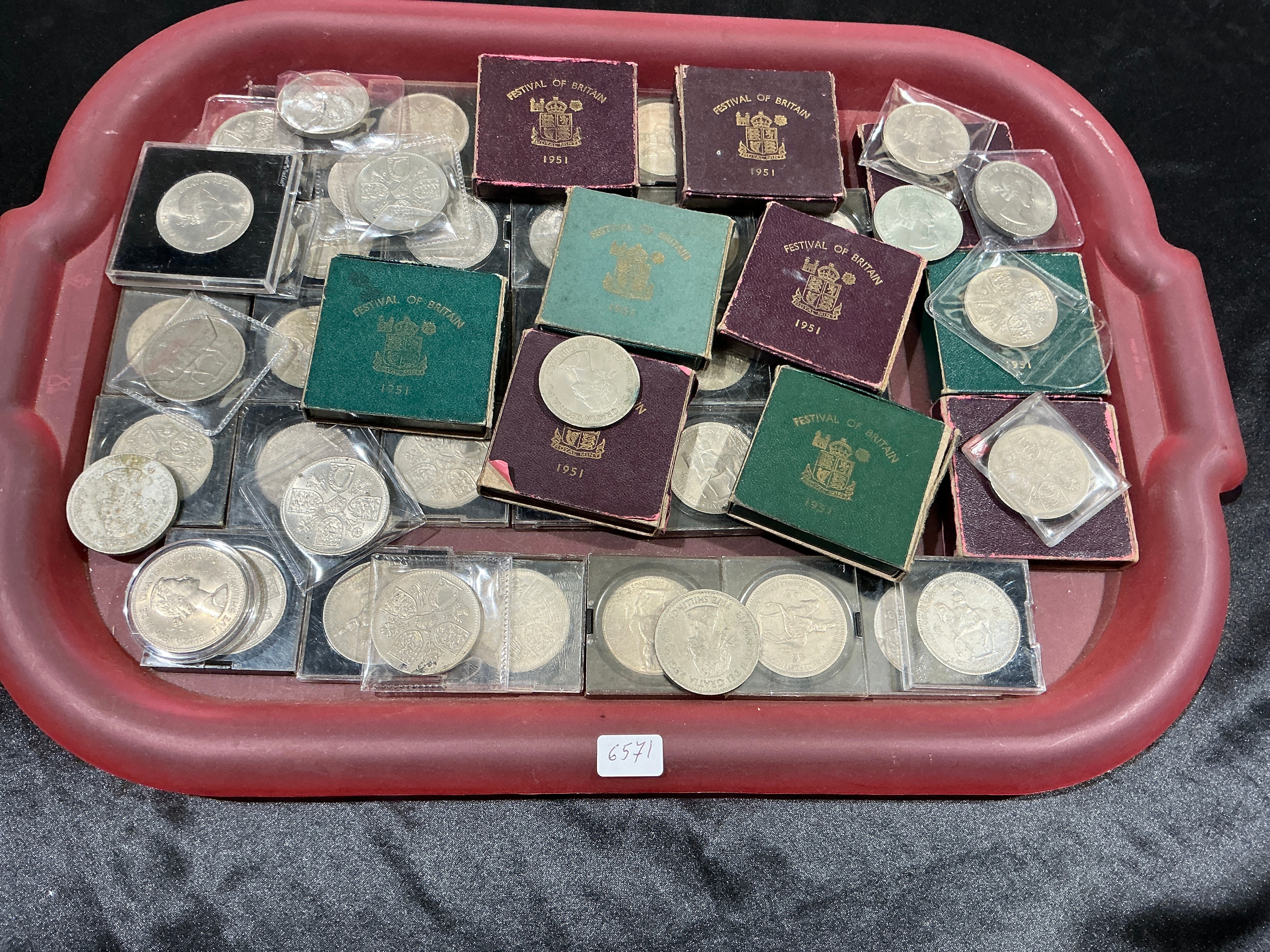 A collection of coins comprising UK commemorative cupro-nickel crowns, featuring numerous 1951 Festival of Britain 5 shilling pieces. The collection includes several examples housed in their original Royal Mint presentation boxes in maroon and green, which feature the Festival of Britain crest and the Royal Mint mark. These 1951 coins feature the portrait of King George VI and the St George and the Dragon reverse design by Benedetto Pistrucci. The group also includes various commemorative crowns for Queen Elizabeth II, such as the 1953 coronation issue featuring the cruciform shields reverse. The items are presented in a red tray and are found in various states of storage including original boxes, plastic flips, and protective capsules. A small white adhesive tag with the number 6571 is located at the bottom of the tray. The 1951 crown was the first UK commemorative coin produced in cupro-nickel rather than silver.
