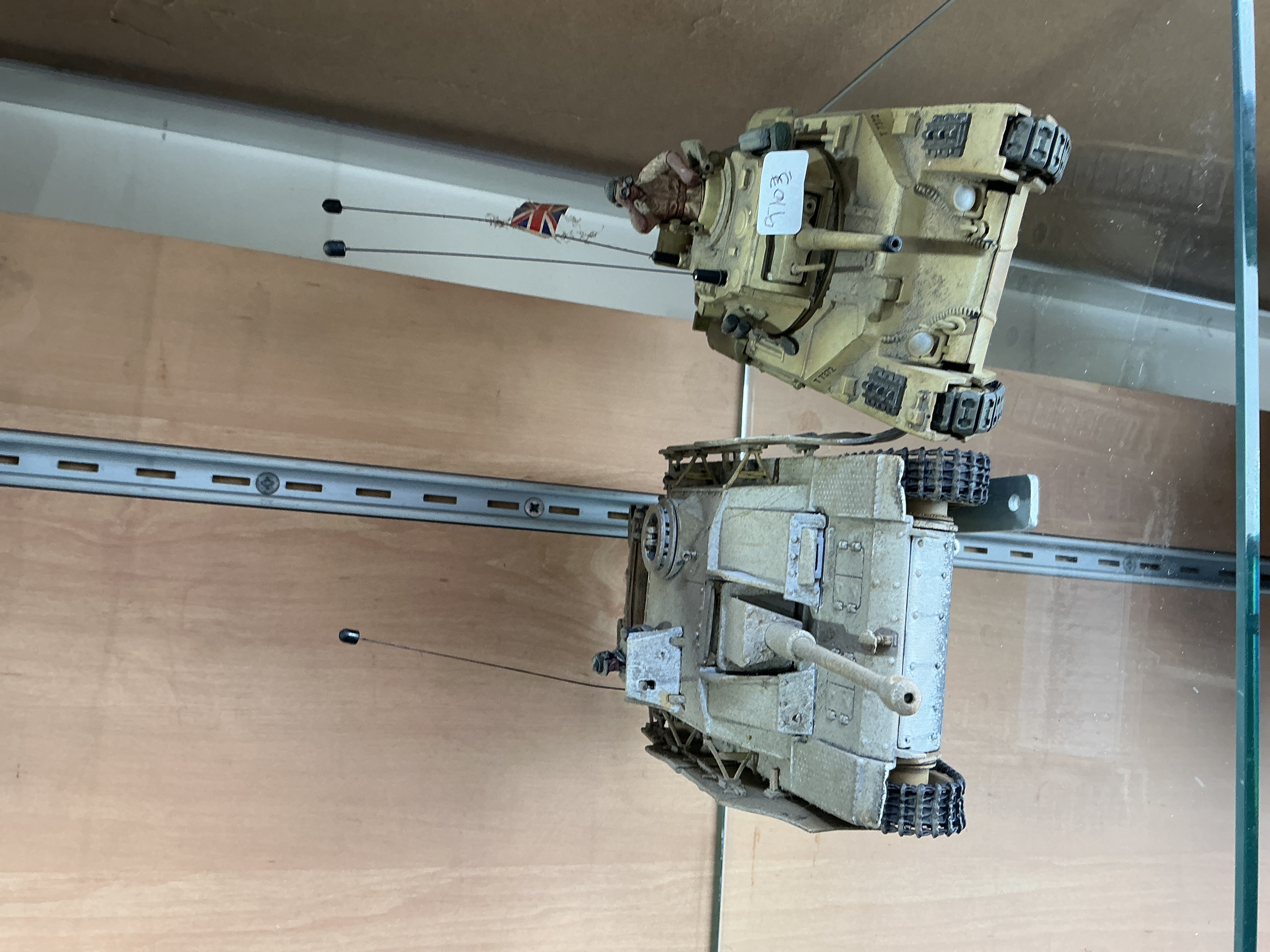 A pair of professionally assembled and painted plastic scale model military vehicles, likely in 1:35 scale. The collection comprises two distinct WWII-era vehicles. The first is a British A13 Mk II Cruiser tank, finished in a desert camouflage scheme with applied weathering. This model features a commander figure in the turret hatch and two vertical antennas, one of which carries a small Union Jack flag. A white adhesive tag with handwritten digits 9703 is present on the turret top. The second vehicle is a German Sturmgeschütz III (StuG III) Ausf. G assault gun, featuring the late-pattern Saukopf (pig’s head) gun mantlet. It is finished in a light desert camouflage with heavy weathering effects and includes a crew figure positioned in the roof hatch. Both models are kit-built from plastic parts.