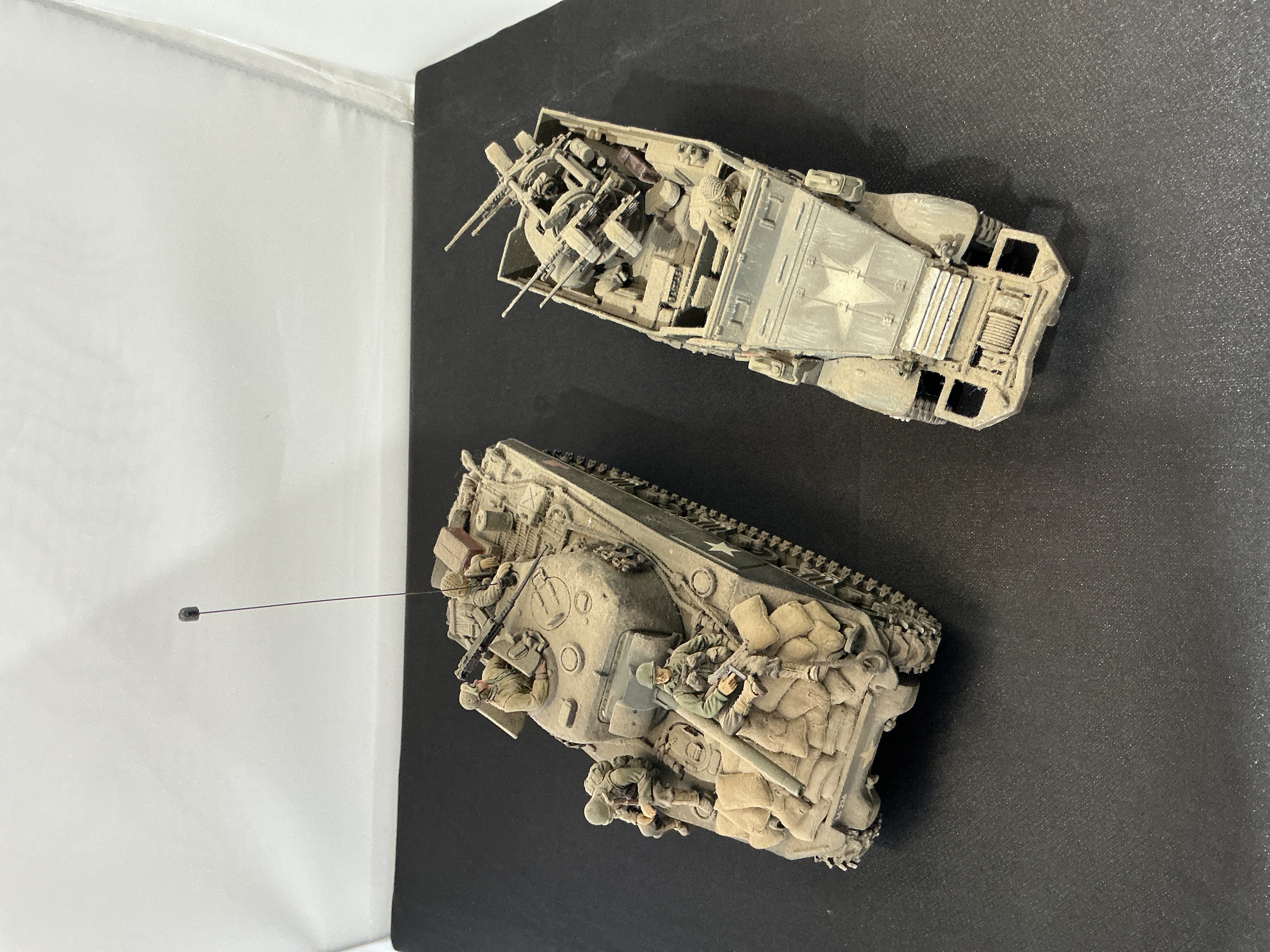 This lot comprises two professionally assembled and weathered plastic scale models of WWII-era US military vehicles, constructed in 1:35 scale. The first model is an M16 Multiple Gun Motor Carriage half-track, featuring a quad-mount Maxson turret with four .50 calibre machine guns. The vehicle is populated with crew figures and finished with a realistic, heavy dusty weathering effect. A white five-pointed Allied star is visible on the bonnet. The second model is an M4 Sherman medium tank, featuring extensive field-modified sandbag armour protection along the front and sides of the hull. The tank includes several crew figures and a radio antenna, finished with a matte weathered effect to simulate operational use. A partial white star is visible on the hull side. Both models are hand-painted static display pieces made from polystyrene.