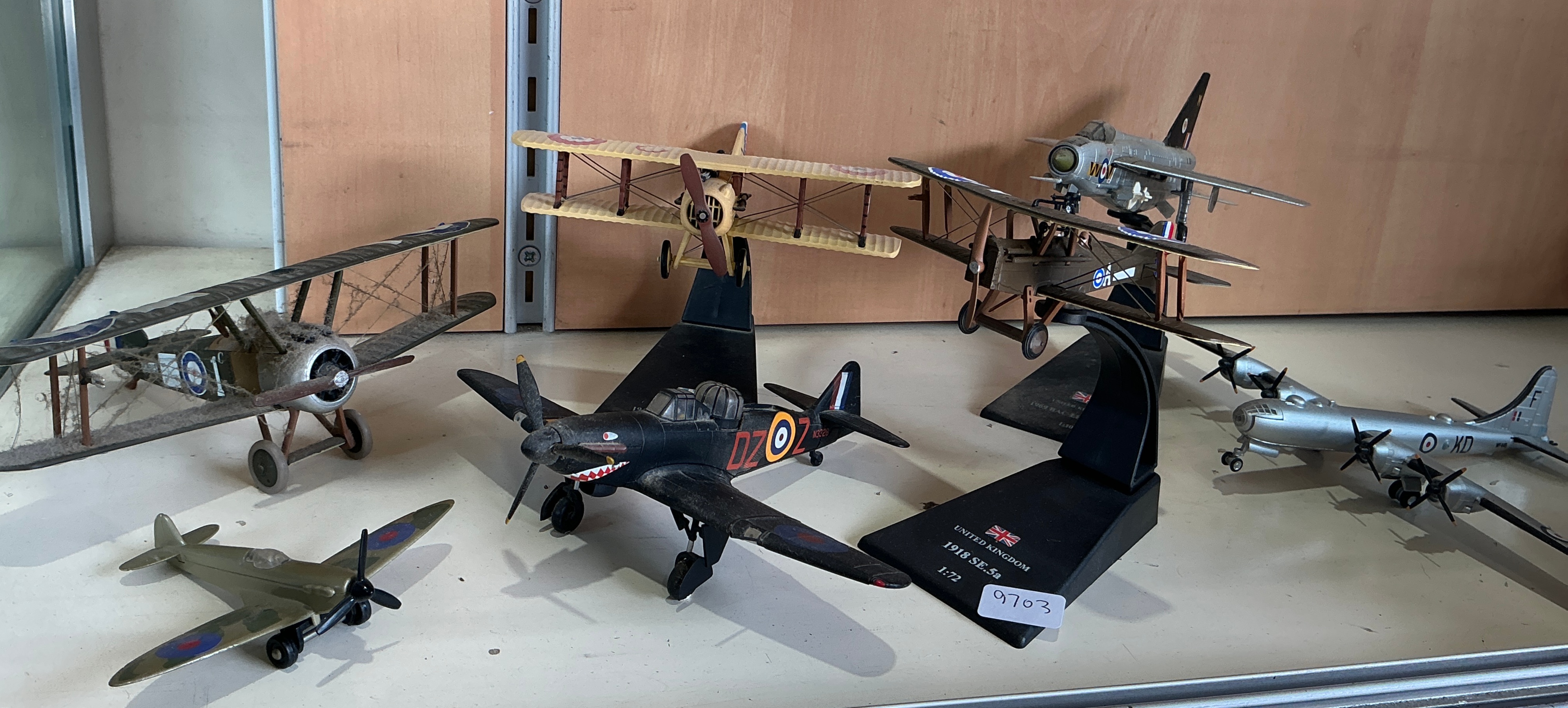 A collection of assorted die-cast and plastic model aircraft representing various eras of military aviation. The group includes a 1:72 scale model of a 1918 S.E.5a biplane mounted on a black plastic display stand inscribed United Kingdom 1918 S.E.5a. Also included is a Hawker Hurricane night fighter in a black livery featuring shark-mouth nose art and fuselage codes DZ Z. Other models comprise an English Electric Lightning jet fighter in a silver finish on a display stand, a four-engine bomber in a silver finish with fuselage codes O KD, a Sopwith-style biplane on a black stand, a camouflaged monoplane fighter, and a heavily weathered WWI-era biplane. The models are constructed from a combination of die-cast metal and plastic components.