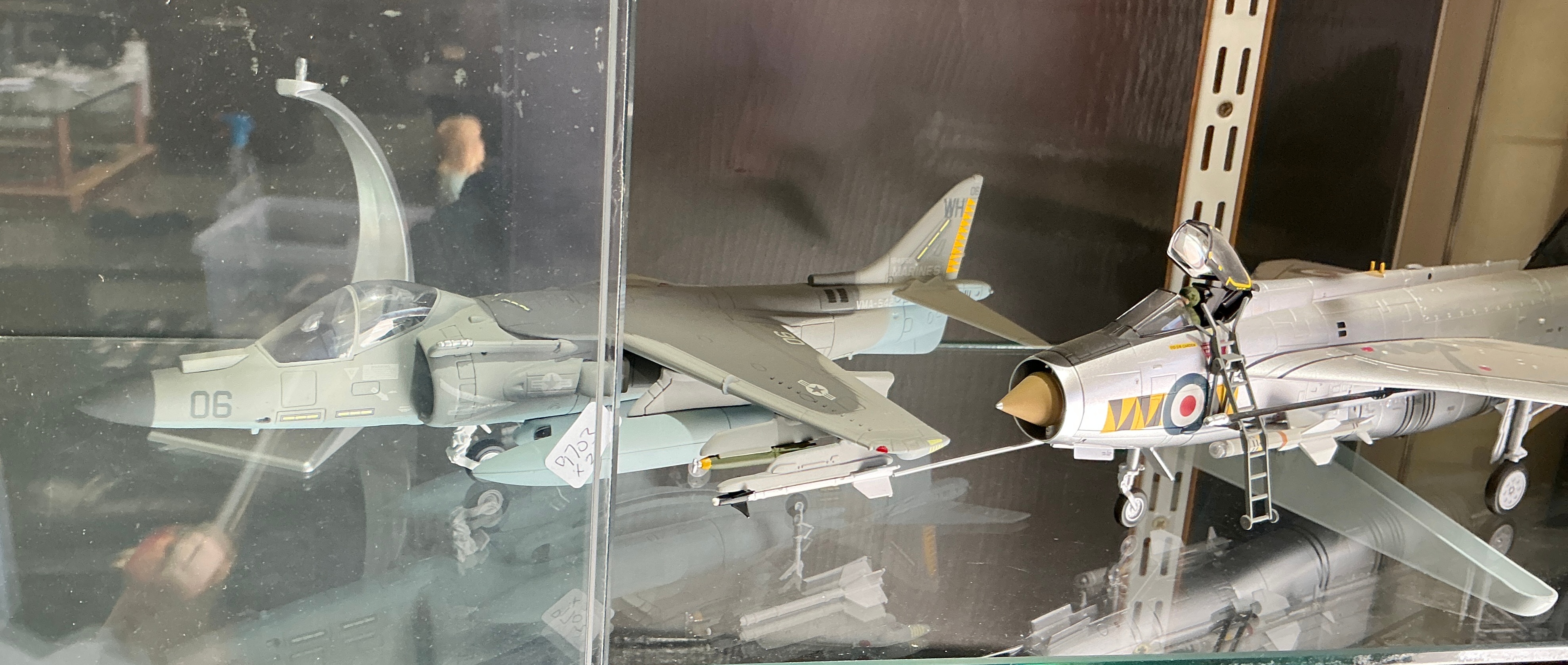 A pair of professionally finished 1:72 scale diecast model aircraft from Hobby Master. The first model is a McDonnell Douglas AV-8B Harrier II Plus, finished in the markings of the United States Marine Corps VMA-542 Tigers squadron. The airframe features a low-visibility grey camouflage scheme with markings including the tail code WH, nose number 06, and VMA-542 squadron identification. It is equipped with various underwing stores, including fuel tanks and missiles. The second model is an English Electric Lightning F.6, presented in the natural metal finish of Royal Air Force No. 111 Squadron. It features the unit’s characteristic yellow and black chevron markings on the forward fuselage and RAF roundels. This model is displayed with an open cockpit canopy and includes an external boarding ladder accessory. Both models are constructed from diecast metal with plastic components.