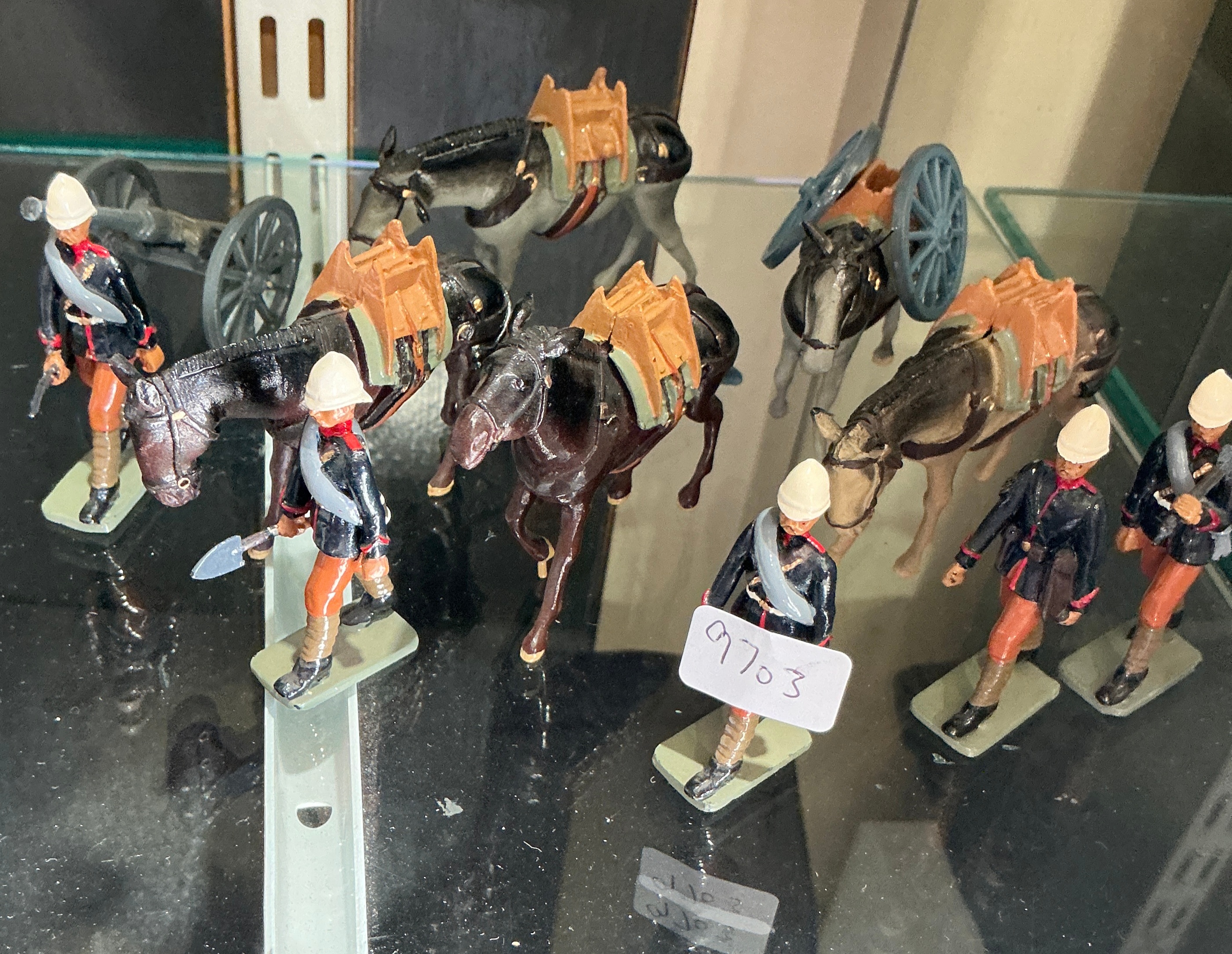 A collection of painted lead military miniatures, including infantry figures and pack animals. The infantry are depicted in British Foreign Service Dress, wearing white pith helmets, dark blue tunics with red facings, and tan trousers. The pack horses are equipped with moulded saddles and bags. One detached spoked wheel is included. These figures are executed in the style of Britains Ltd, specifically echoing their colonial-era series. A white adhesive inventory tag numbered 9703 is attached to one figure.