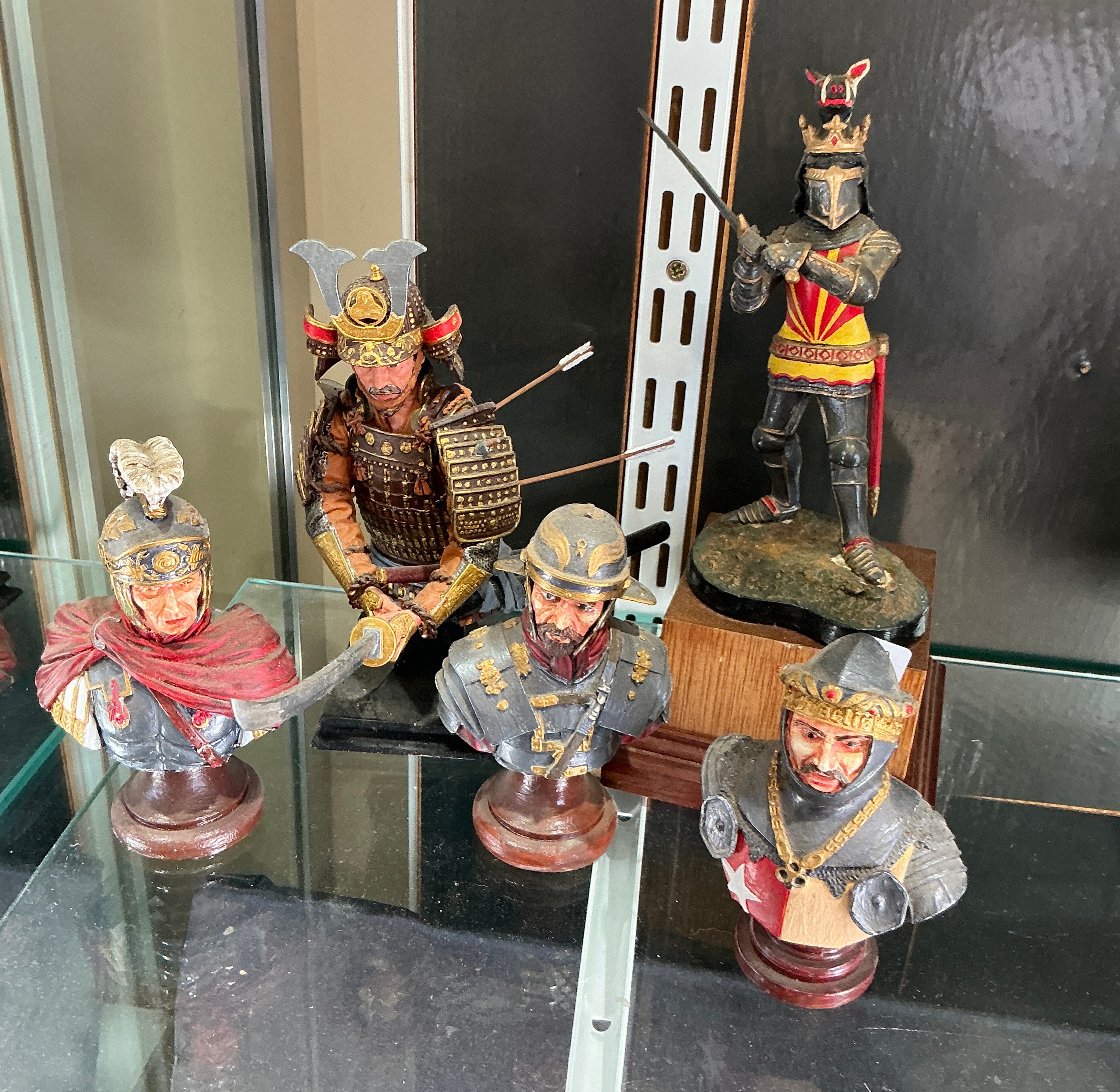 A collection of hand-painted military miniature figures and busts depicting various historical warriors. The assembly includes a full-standing knight in black plate armour wearing a yellow and red heraldic surcoat and a crowned helm with a crest, mounted on an integral scenic base. Also featured is a detailed full figure of a samurai in traditional lamellar armour, depicted in a dynamic pose with a katana and arrows protruding from the back area. The collection also includes portrait busts mounted on turned wooden circular plinths, depicting a medieval knight in armour with a surcoat bearing a red cross on a white ground, a soldier in ornate armour with a classical-style helmet featuring golden cresting, and a figure in the Roman style wearing a red cloak and a helmet with a white plume. These miniatures appear to be cast in resin or white metal and exhibit detailed professional painting. No visible maker’s marks or signatures are present.