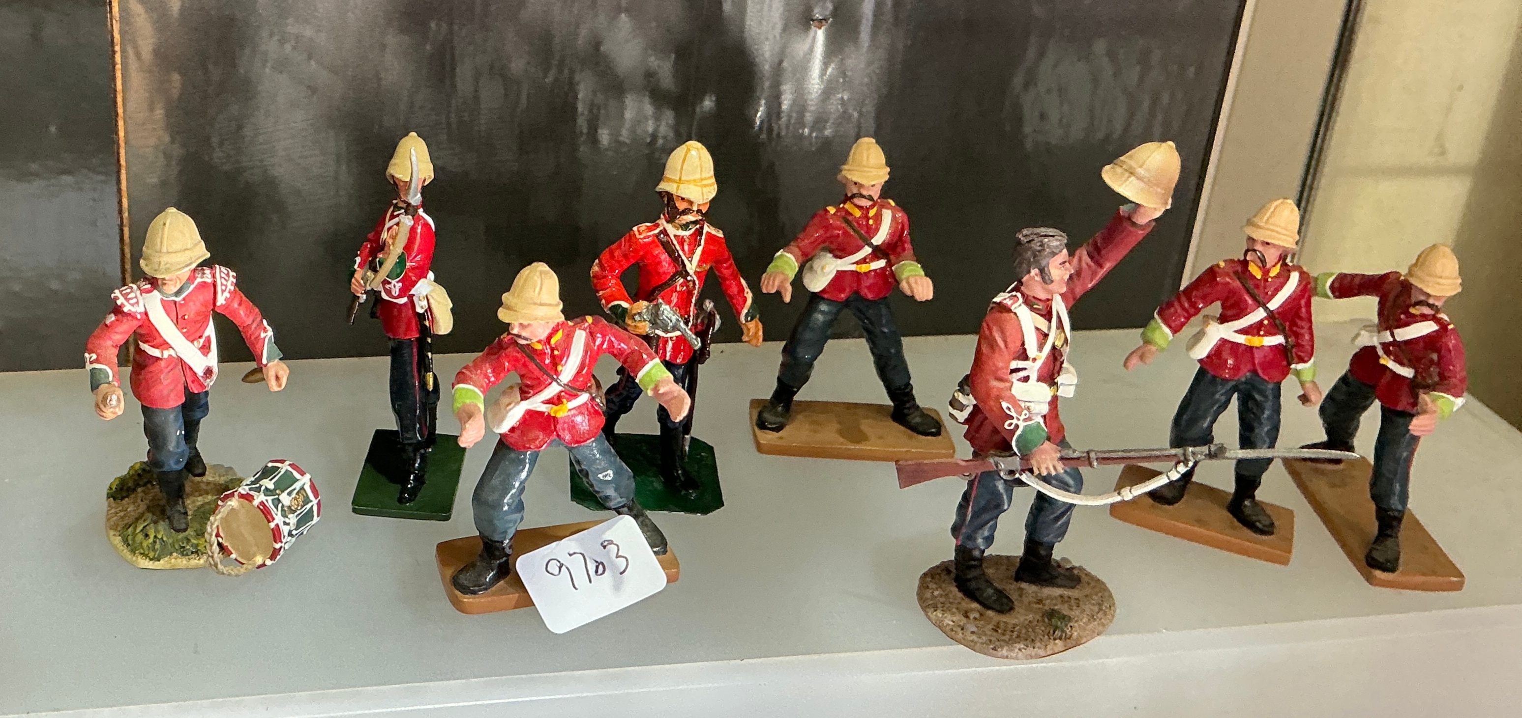 A set of hand-painted metal toy soldiers by Trophy Miniatures of Wales, depicting the 24th Regiment of Foot (South Wales Borderers) during the Anglo-Zulu War of 1879. The figures are constructed from metal and finished in a traditional glossy style. The uniforms consist of red tunics with green facings on the collars and cuffs, white cross-belts, and dark trousers, topped with khaki foreign service pith helmets featuring puggarees. The collection includes an officer in a dynamic pose armed with a revolver, a soldier waving his pith helmet in a hurrah gesture while carrying a rifle with fixed bayonet, and infantrymen in various action poses. A detached side drum with regimental-style painted patterns is also included. A small white adhesive label with the handwritten number 9783 is affixed to the base of one figure.