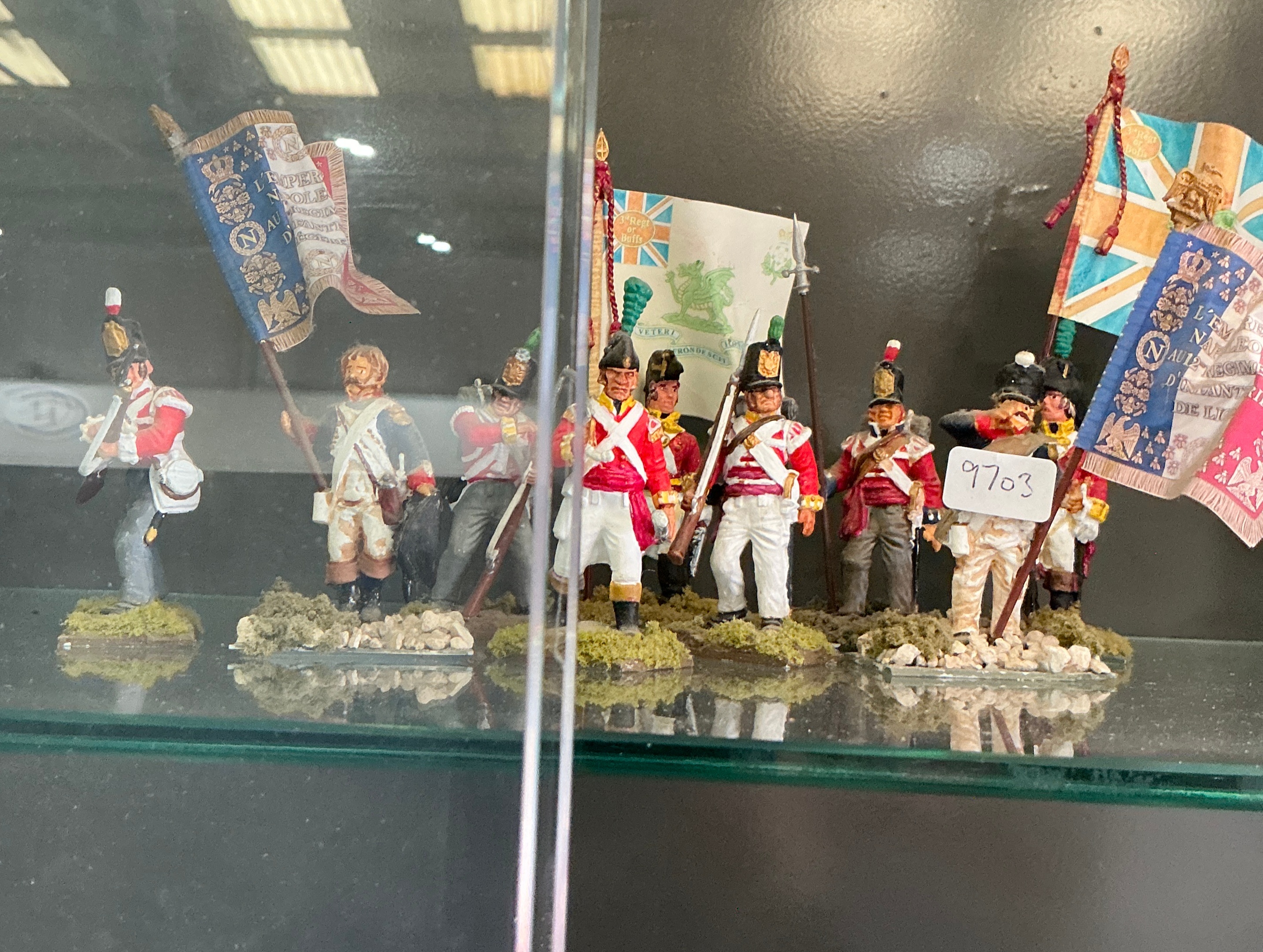 A collection of professionally hand-painted military miniatures by King & Country, depicting infantry from the Napoleonic Wars. The lot comprises figures representing both French Imperial and British line regiments. The French figures are dressed in Infanterie de Ligne campaign uniforms, featuring blue coats with white lapels, red cuffs, and shakos. Two French figures carry regimental standards topped with the Imperial eagle; one blue flag bears the inscription L’EMPEREUR NAPOLEON AU REGIMENT D’INFANTERIE DE LIGNE around a central crowned N cipher. The British figures are shown in characteristic red coats and white trousers, wearing the Belgic shako typical of the 1812 to 1815 period. Standards include the King’s Colour and a green regimental colour featuring a gold crown over an Irish harp. The figures are constructed from white metal and mounted on individual scenic bases with textured flocking and vegetation. A white inventory tag marked 9703 is present on the base of one figure.