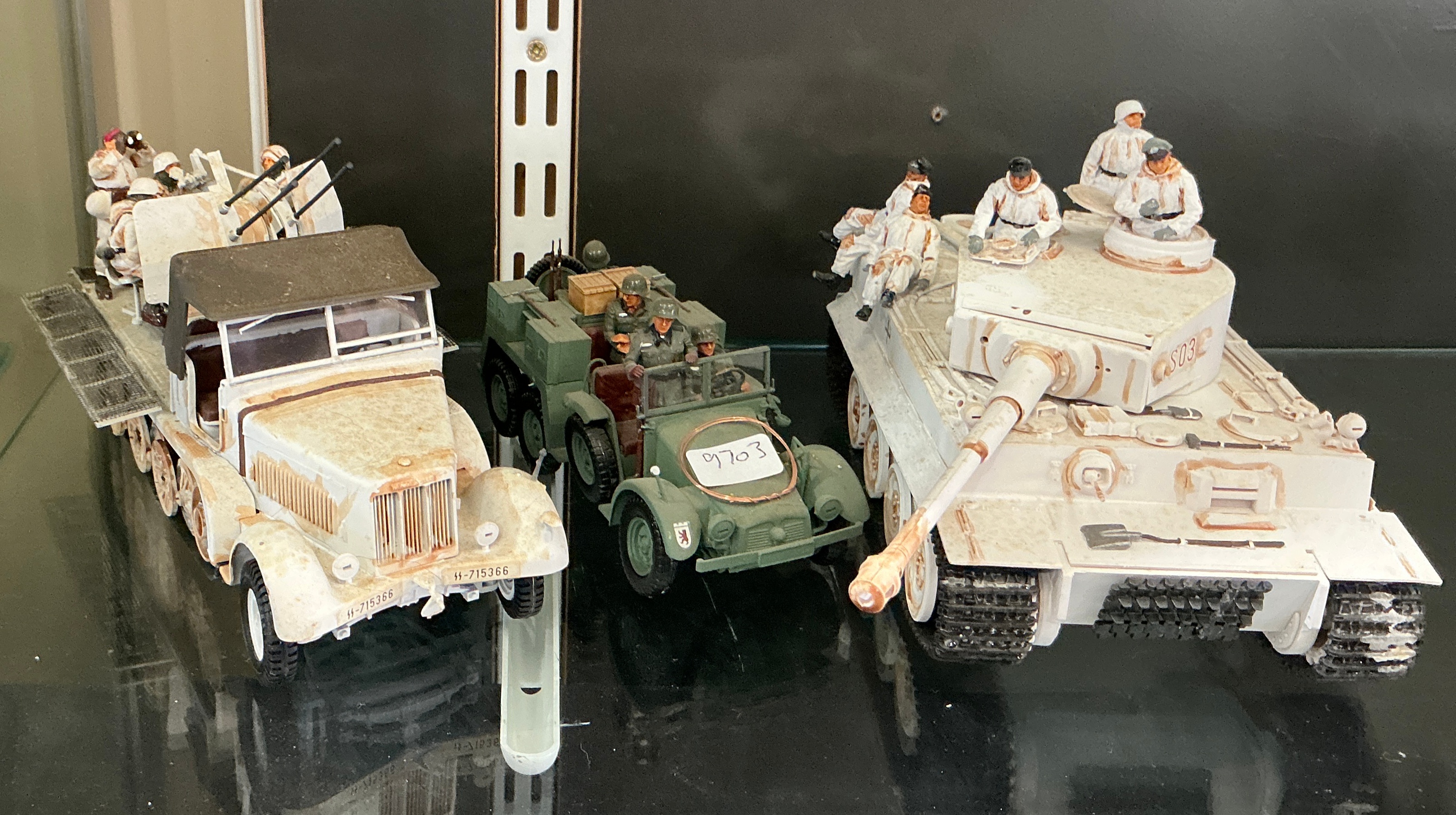 A collection of three assembled and hand-painted plastic military scale models in 1/35 scale, depicting German Second World War vehicles. The collection consists of an Sd.Kfz. 7/1 half-track, a light personnel carrier, and a Tiger I heavy tank. The Sd.Kfz. 7/1 is an 8-ton semi-tracked prime mover mounted with a 2cm Flakvierling 38 quad anti-aircraft gun, likely from a Tamiya kit. It is finished in a weathered winter whitewash camouflage over a dark yellow base and features the licence plate WH-715366 and several crew figures in winter uniforms. The light personnel carrier is finished in olive green with a unit insignia on the front left fender and includes crew figures and cargo; a white circular sticker with the handwritten number 9703 is present on the bonnet. The Tiger I Ausf. E heavy tank is finished in a weathered winter whitewash scheme with the turret tactical number S03 and features multiple crew figures positioned on the hull and turret. These models are likely produced by manufacturers such as Tamiya, Dragon, or Italeri.