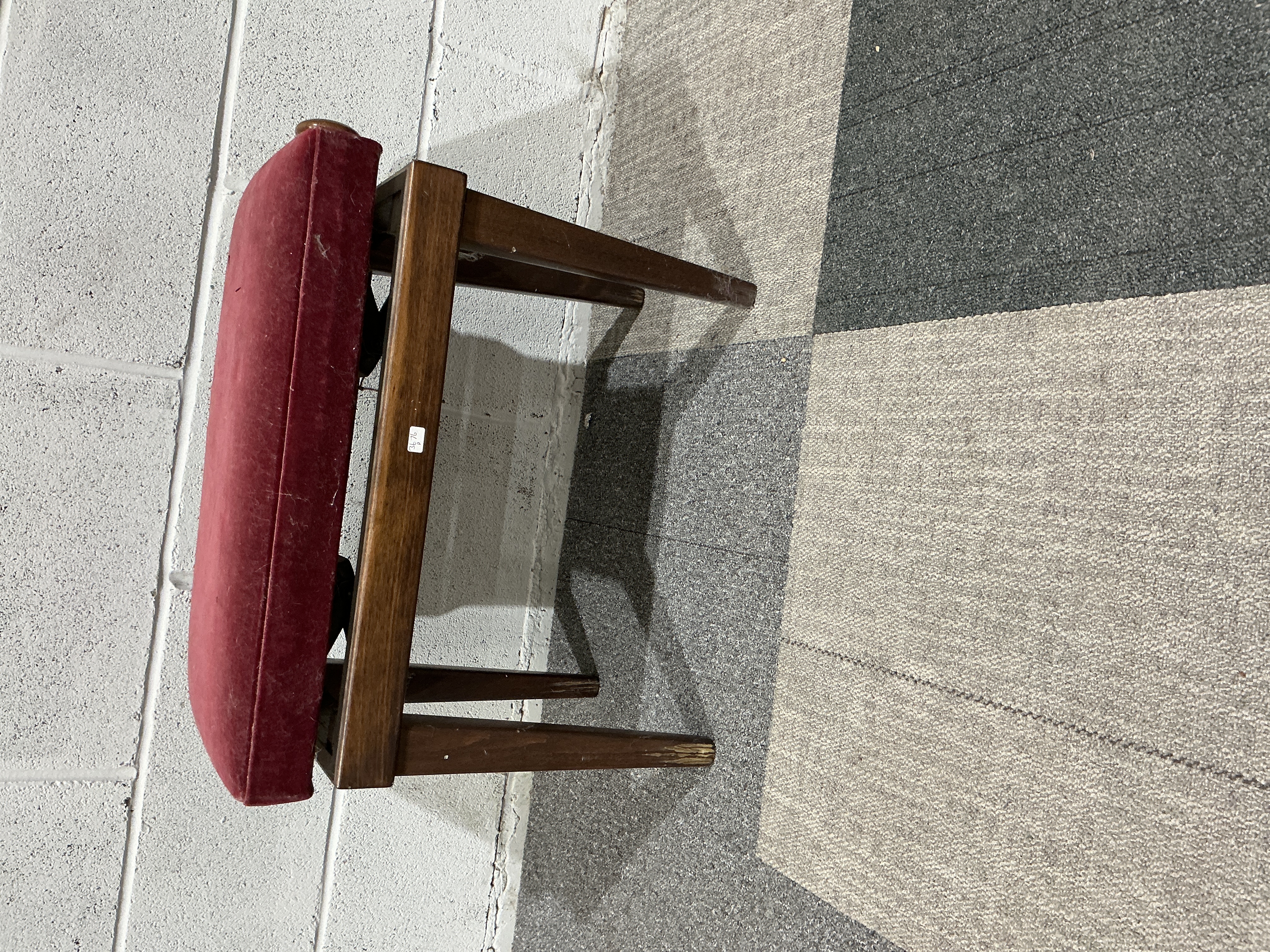 A mid-century modern style stool designed for use as a piano or dressing table seat. The piece features a rectangular frame crafted from a medium-toned hardwood with a teak-effect finish. The structure is supported by four square-tapered legs that are slightly splayed. The stool is fitted with a fixed, padded rectangular seat upholstered in a red velvet material. A small rectangular paper label is present on one side rail, likely functioning as an inventory or lot tag.