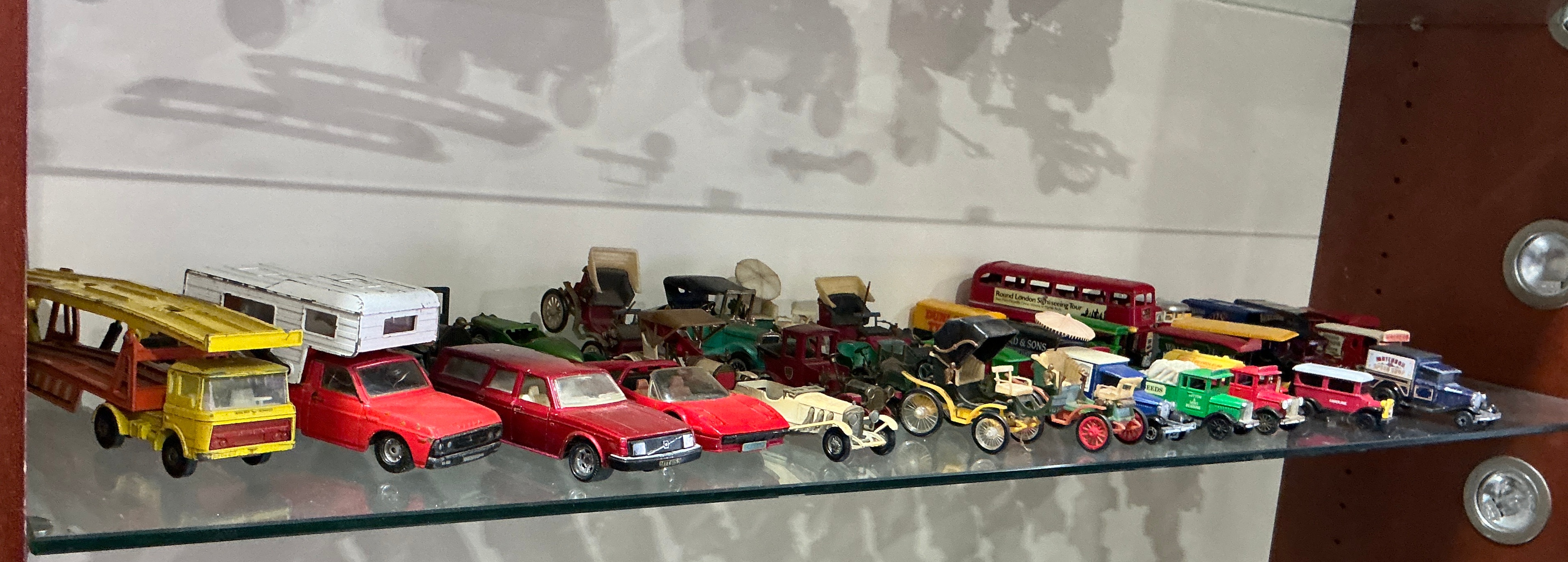 A collection of model vehicles including various automotive replicas from the mid-to-late 20th century. The group features a significant selection of vintage and veteran motor cars consistent with the Matchbox Models of Yesteryear series, including open-top tourers, hansom-style motor vehicles, and early delivery vans featuring diverse period liveries. Included in the transport and utility category are a yellow two-tier car transporter truck, a red pickup truck fitted with a white camper shell, and a red double-decker bus with Round London Sightseeing Tour decals. The collection also contains several passenger cars, notably a red Volvo 240 estate and a low-profile red sports car in the style of a Lotus Esprit. Commercial vehicles are represented by multiple small-scale delivery trucks and vans in various colours including green, red, and blue. All models are free-wheeling and constructed from die-cast metal with plastic components for windows, tyres, and interiors. The items are presented loose without original packaging.