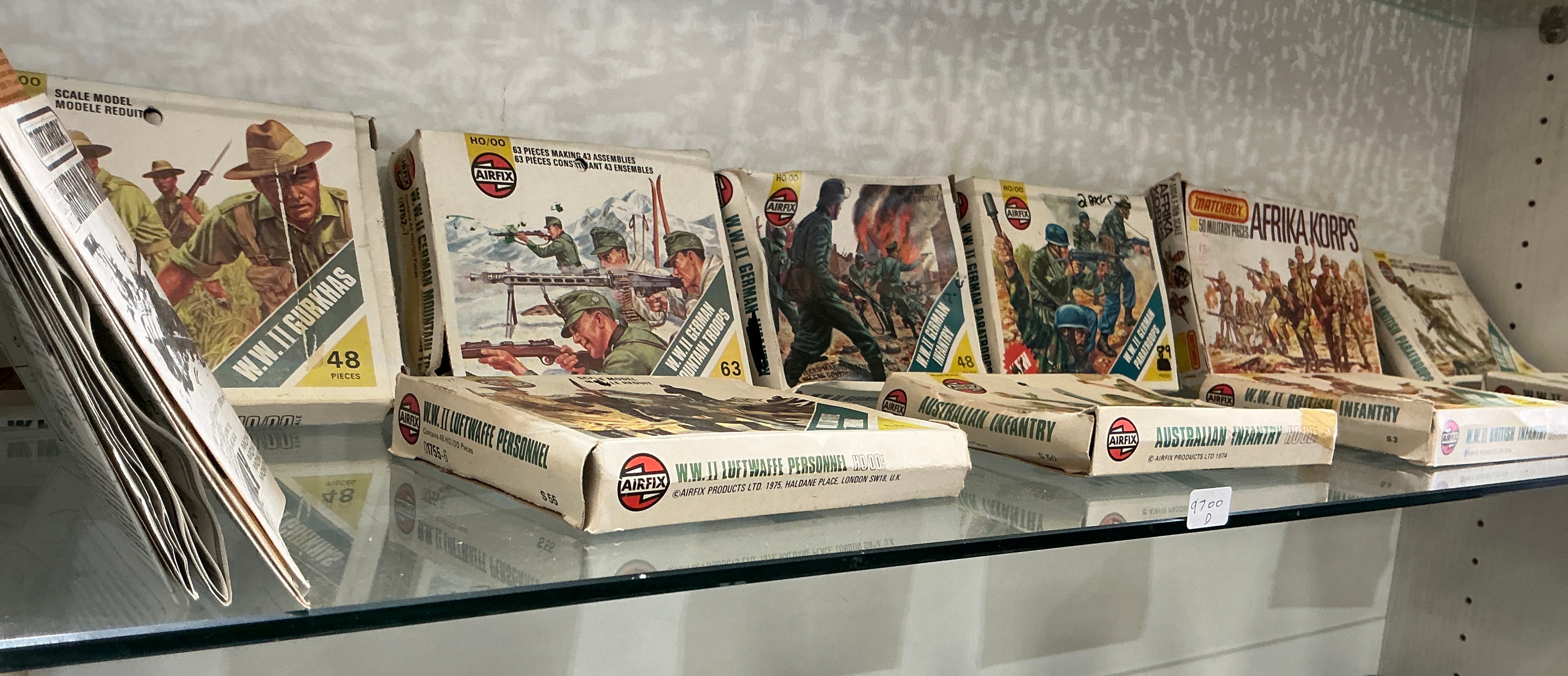 This collection consists of several vintage boxed military figure sets produced by Airfix and Matchbox. The majority of the sets are manufactured by Airfix in HO/OO scale and include titles such as W.W.II Luftwaffe Personnel, Australian Infantry, W.W.II British Infantry, W.W.II Gurkhas, W.W.II German Mountain Troops, W.W.II German Infantry, W.W.II German Paratroops, and W.W.II British Paratroops. A single Matchbox set is present, titled Afrika Korps in 1:76 scale. The sets are comprised of injection-moulded plastic figures contained within their original printed cardboard packaging featuring colour illustrations. Visible markings on the Airfix boxes include copyright dates of 1974 and 1975, with manufacturer details for Airfix Products Ltd, Haldane Place, London.