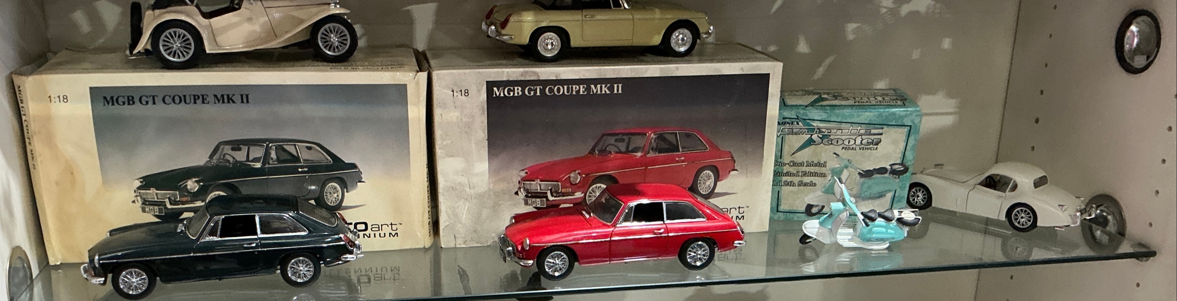 This collection comprises a variety of die-cast automotive models, aircraft, and action figures. A primary feature is a pair of AUTOart Millennium 1:18 scale MGB GT Coupe MK II die-cast models, finished in British Racing Green and Red. Both models feature detailed interiors and wire-spoke wheels and are accompanied by their original cardboard display boxes. Also included is an Arko Products 1:12 scale die-cast model of a vintage-style scooter with a sidecar, finished in teal and white, labelled as a Limited Edition pedal vehicle in its original packaging.