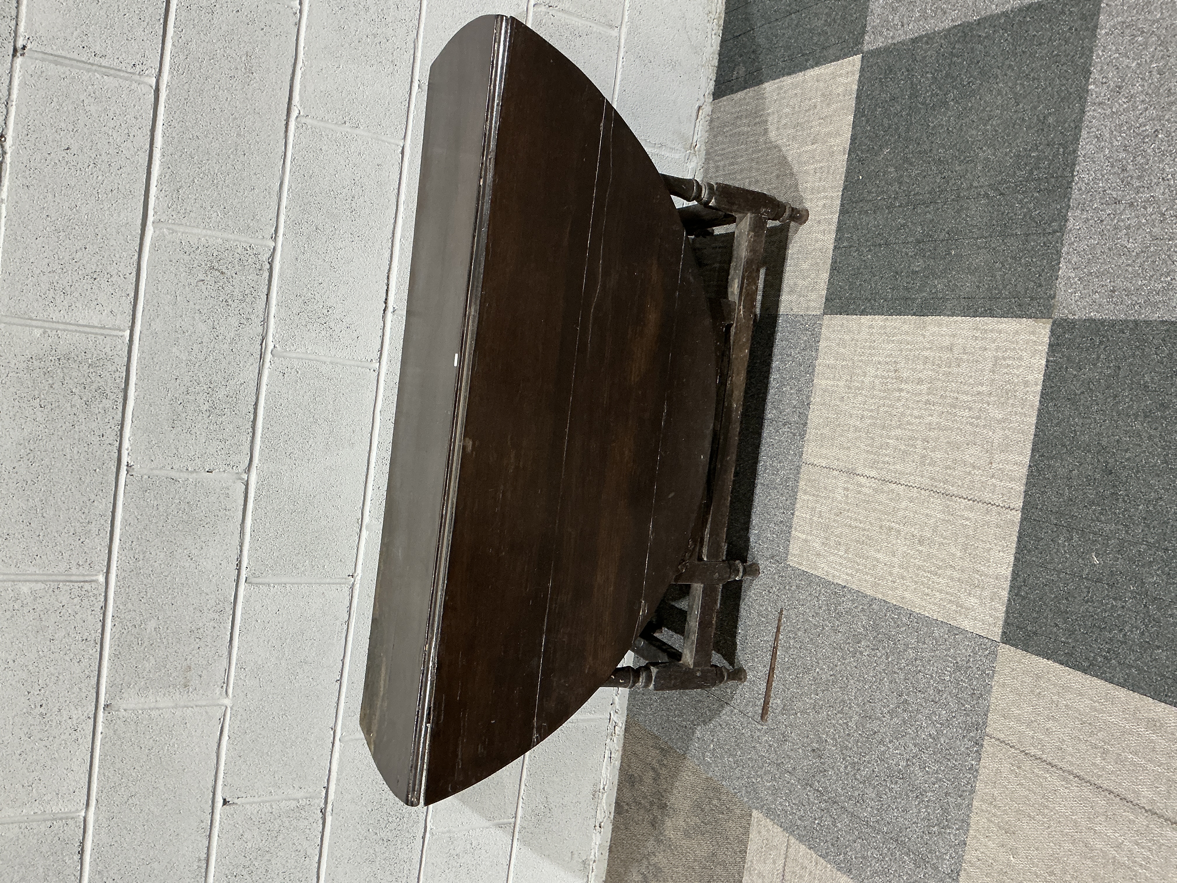 An English gateleg drop-leaf table constructed from solid oak with a dark-stained finish. The table comprises a narrow fixed central section flanked by two semi-oval drop leaves, forming an oval surface when fully extended. The base is supported by six legs featuring ring and baluster turnings, joined by low-profile squared stretchers. Two of these legs are hinged gatelegs that swing out to support the drop leaves. The design is consistent with the Jacobean style, common in late 17th to 18th-century English furniture. No maker marks, stamps, or labels are visible on the frame or underside of the piece.
