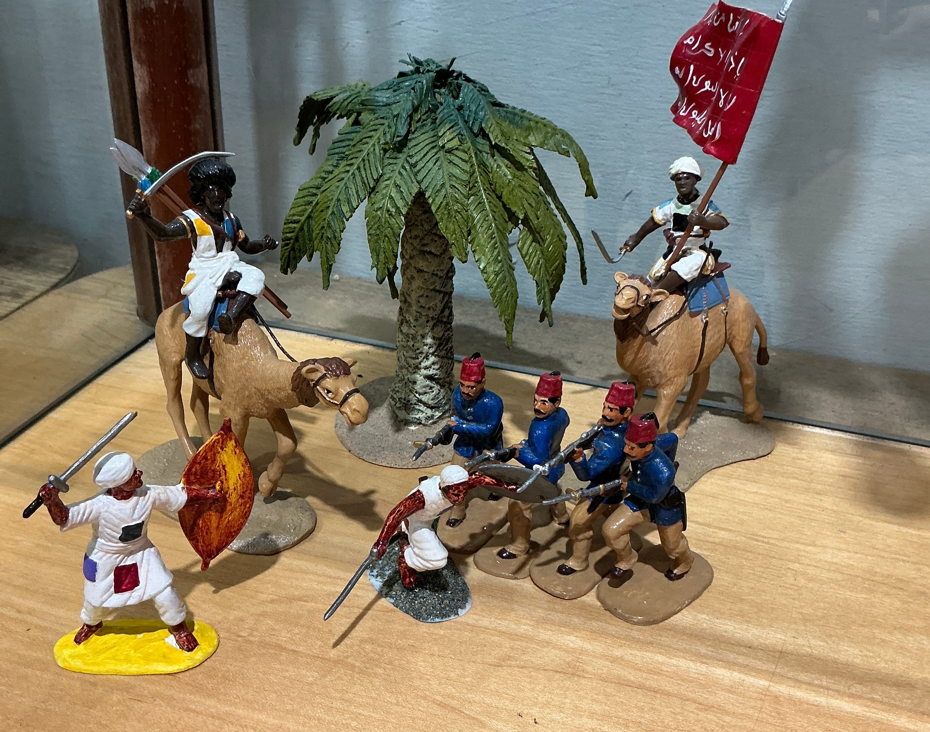 This collection of hand-painted military miniature figurines depicts personnel and accessories from late 19th-century desert campaigns. The figures are constructed from cast metal. The set features two figures mounted on camels, including one carrying a red banner with white Arabic-style script and another armed with a spear and shield. There are four foot soldiers dressed in blue tunics, brown trousers, and red fezzes, each carrying a rifle. Two additional foot soldiers are depicted in traditional white robes, one of whom is in an active pose with a sword and shield. The group is accompanied by a palm tree accessory on a textured base. Each piece is finished with hand-applied paint to represent various military and cultural attires of the period.