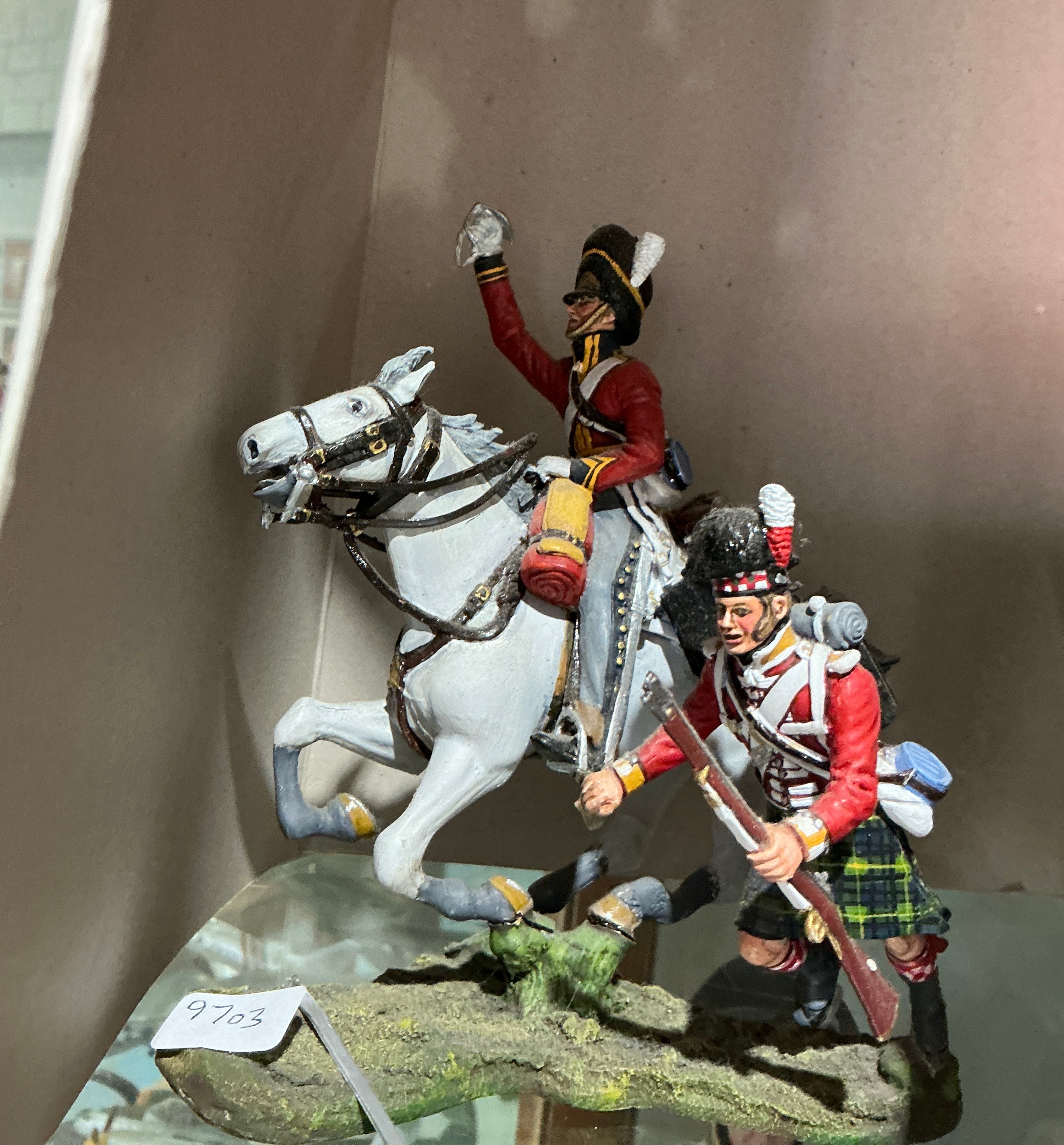 A hand-painted white-metal military miniature group by Charles C. Stadden, identified as Model No. 105 titled Scotland Forever. The diorama depicts a legendary scene from the Battle of Waterloo in 1815, representing the charge of the Union Brigade. The composition features a trooper of the Royal North British Dragoons (The Scots Greys) mounted on a charging grey horse, wearing a red tunic with yellow facings and a distinctive black bearskin cap with a white plume. Accompanying the cavalryman is a soldier of the 92nd (Gordon Highlanders) Regiment of Foot, depicted holding the trooper’s stirrup leather to maintain pace during the charge. The Highlander is wearing a red tunic, feather bonnet, and a kilt in Gordon tartan. The figures are mounted on an integral, hand-painted scenic base textured to resemble grass and earth. A white paper tag with the handwritten inventory number 9703 is attached to the base.
