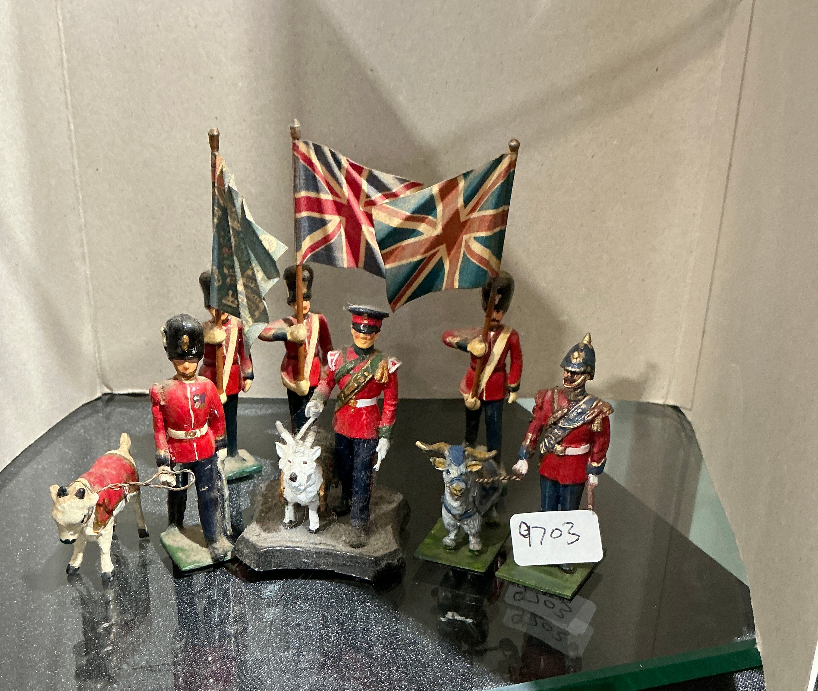 A collection of vintage hollow-cast lead toy soldiers manufactured by W. Britain, as evidenced by the markings BRITAINS and ENGLAND incised on the bases. The assortment features various members of the British Army in ceremonial dress. Included is a Goat Major with a white goat mascot, associated with the Royal Welch Fusiliers, alongside a standard bearer carrying a Union Jack flag. The group further comprises figures in the ceremonial dress of the Foot Guards wearing bearskin caps, soldiers in peaked caps, and figures wearing spiked Home Service helmets. Several animal mascots are included, such as a dog wearing a red coat. The figures are hand-painted lead.