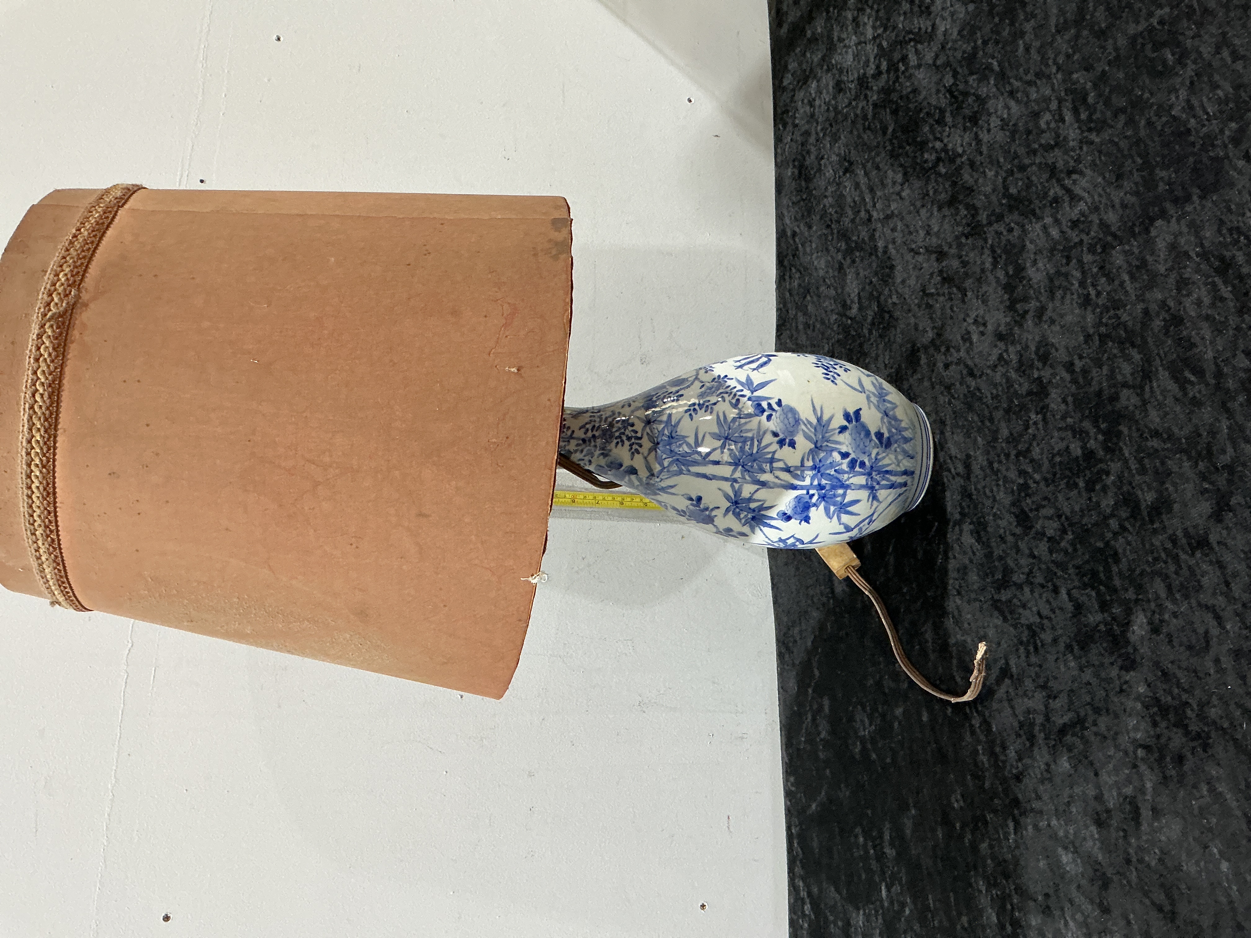 This object is a Japanese porcelain vase from the Meiji period (1868-1912) that has been converted into a table lamp. The porcelain body is decorated in underglaze blue with a continuous botanical design featuring flowering prunus branches and bamboo. The underside of the base features a hand-written transcription in blue underglaze: Dai Nippon Hichozan Shinpo-zo (Great Japan, Hichozan Shinpo made). This mark is associated with the workshop of Tashiro Mon-emon of Arita and is of the period. The lamp is fitted with a tapered paper shade and vintage electrical components.