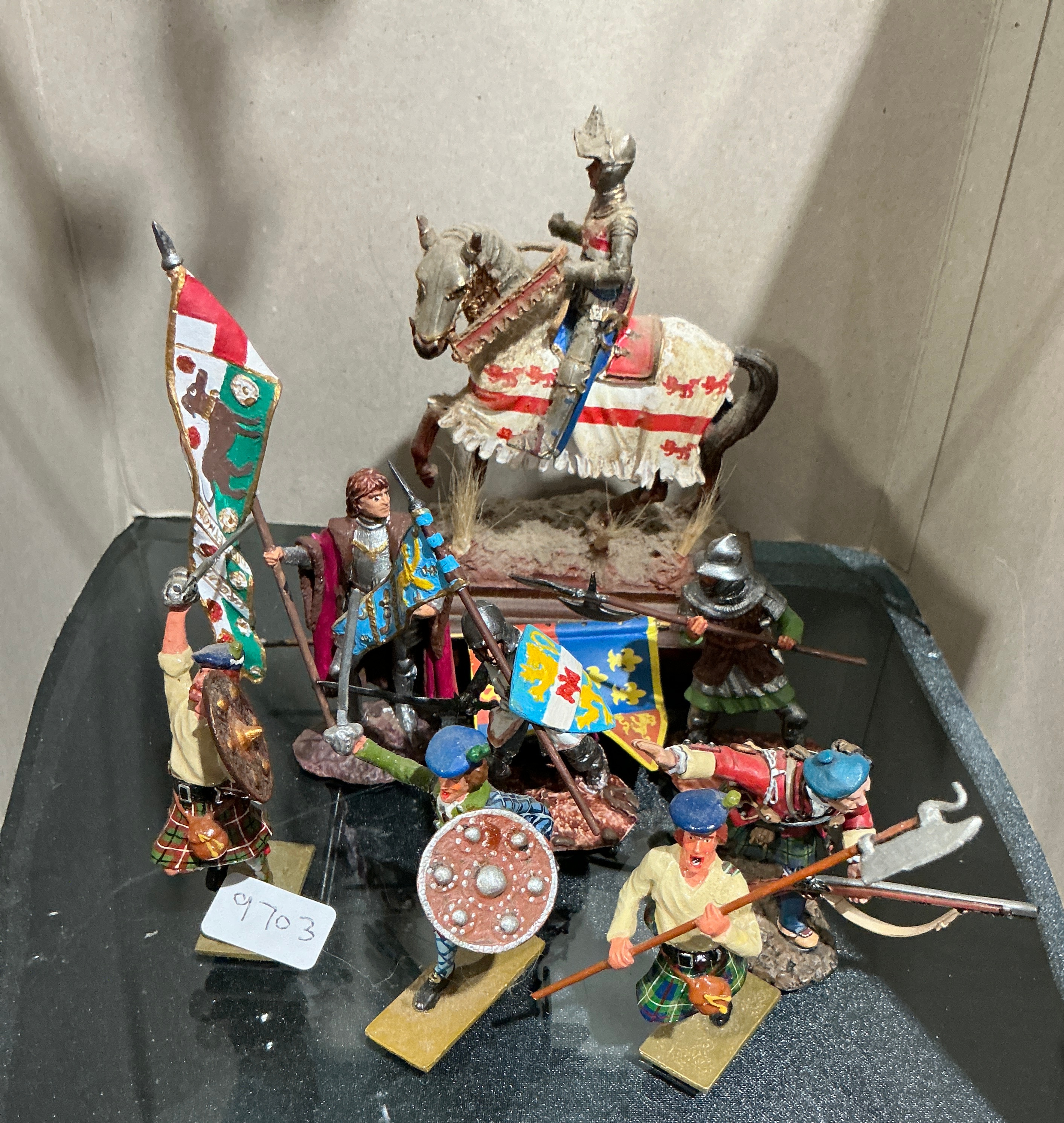 An assortment of hand-painted metal miniature figures representing a medieval or early modern military scene. The collection includes a mounted knight in full plate armour seated upon a caparisoned horse, with the caparison decorated in white and red heraldic lions rampant. Accompanying the knight is a banner-bearer holding a standard with green, white, and red segments featuring a central animal motif. The group is completed by several infantry soldiers, including figures equipped with a halberd, polearms, and swords. One figure is depicted with a traditional Highland-style targe shield and tartan hosing, suggesting a conflict such as the Anglo-Scottish Wars. The figures are cast from a metal alloy and finished with detailed hand painting. A white adhesive tag with the handwritten numerals 9703 is present on the base of one figure. There are no other visible maker marks or stamps.