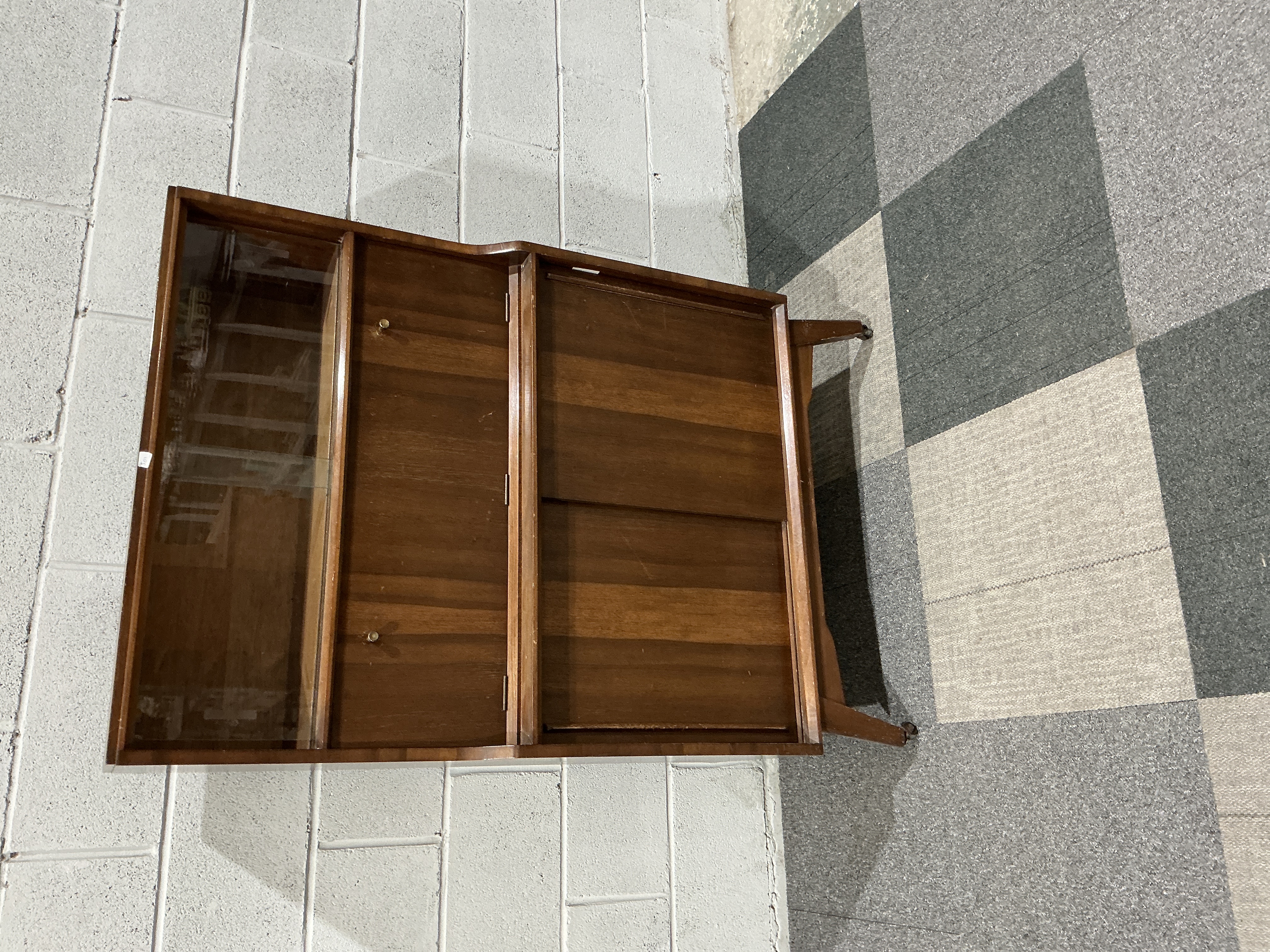 A mid-century modern single-piece secretaire cabinet, finished in teak veneers with solid wood components. The unit is divided into three vertical sections. The left section features a compartment with a single glass door for display. The central section comprises a drop-front door that opens to reveal a fitted writing interior, complete with vertical pigeonhole dividers and a small central drawer with a red pull handle. The right section is enclosed by a pair of sliding wood doors. The drop-front is fitted with two circular brass-toned pull knobs. The unit is raised on four tapered square legs connected by a decorative apron. The interior of the secretaire section features a contrasting lighter-toned wood veneer. No maker’s marks or stamps are visible on the surfaces shown.