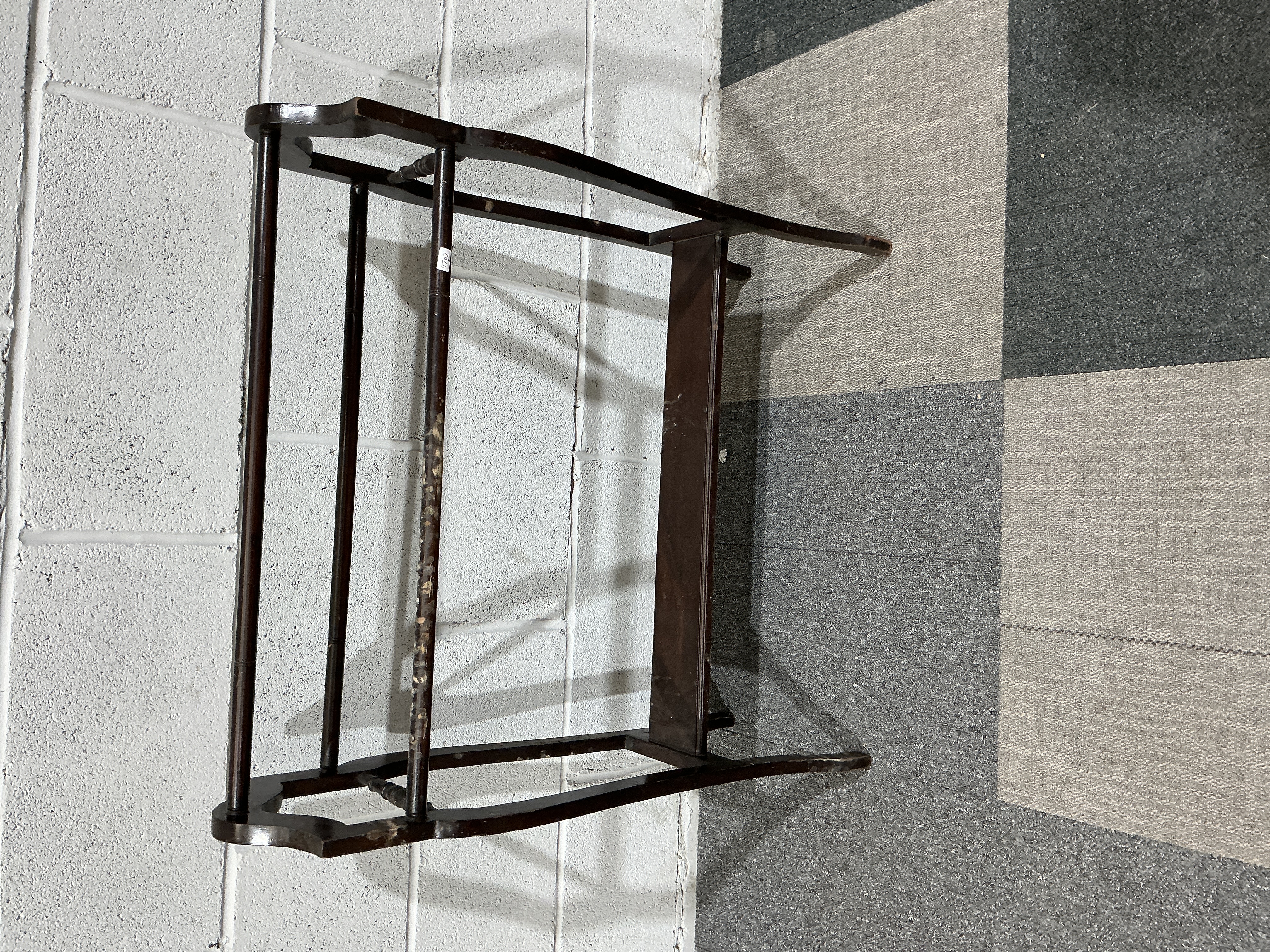 A mahogany blanket stand featuring a slatted top with three longitudinal rails set into decoratively shaped end supports. The structure is supported by four square-section legs that splay slightly at the feet, reinforced by two turned side stretchers. A small white paper inventory label marked 1754 is adhered to one of the top rails.
