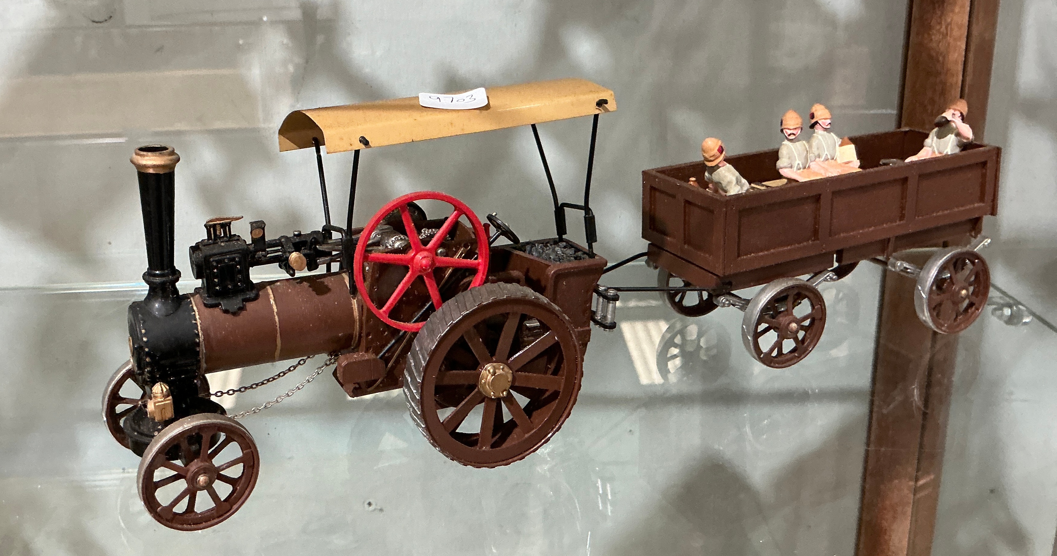 A collectible toy traction engine and trailer set, identified as the Dr. Livingstone Safari model produced by Schylling. The traction engine features a brown-painted boiler, a black smokestack, and a black front assembly. It is equipped with a prominent red-painted spoked flywheel and a yellow rectangular canopy supported by black posts. The manual steering mechanism uses a chain linkage connected to the front axle. The accompanying open-top trailer is finished in matching brown and sits on four spoked wheels. The trailer contains a set of four hand-painted figures wearing light-coloured safari uniforms and pith helmets. The model is constructed from a combination of die-cast metal and plastic components. A white rectangular inventory label with the handwritten number 4703 is adhered to the top of the canopy.