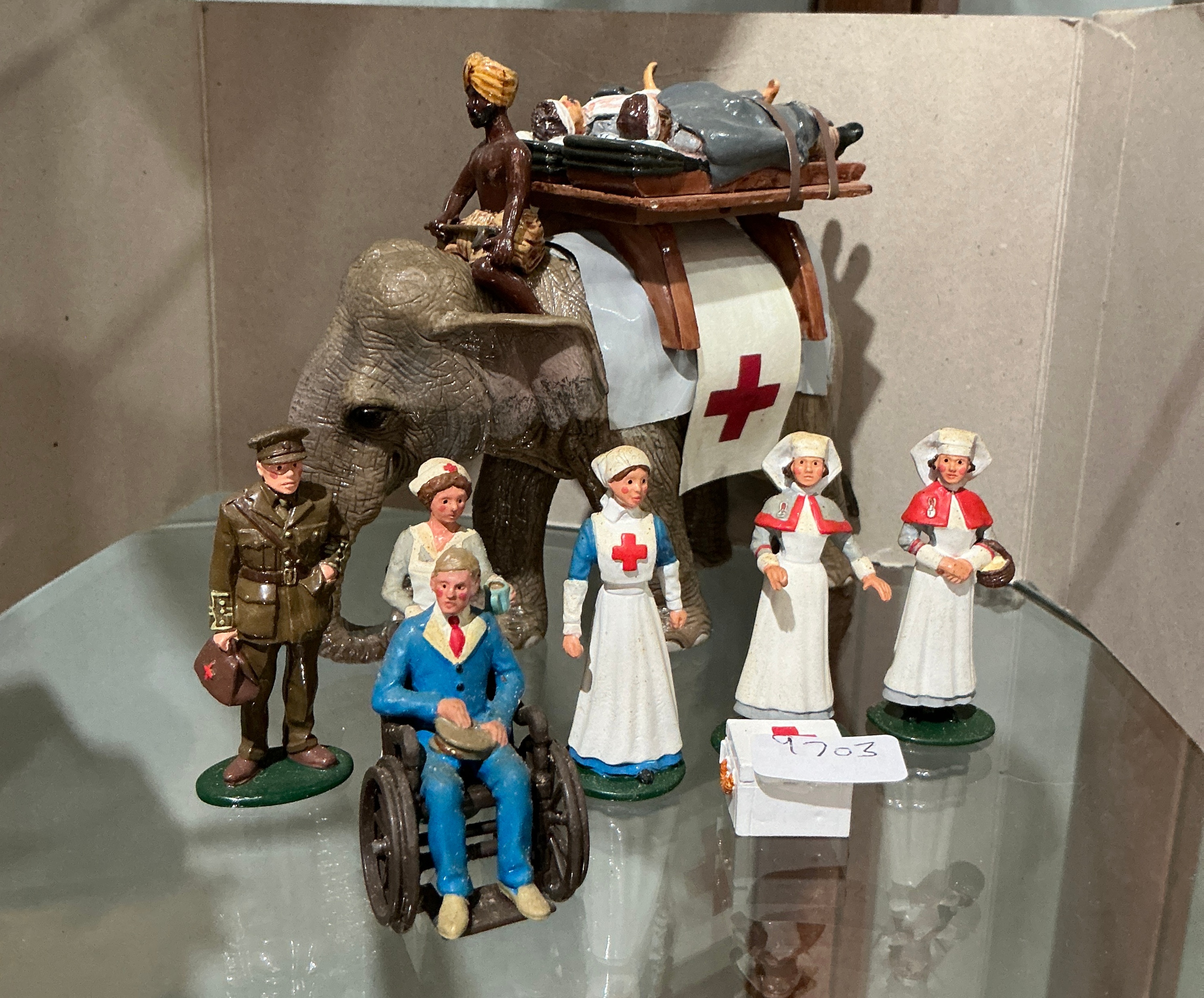 A collection of hand-painted cast metal miniature figurines by Tommy Atkins, depicting British military medical services in a colonial or First World War context. The set features an Indian elephant outfitted as a field ambulance with a white banner bearing a red cross, carrying a wooden litter for wounded soldiers and led by a mahout. The collection further includes several female nursing figures in various uniforms, including Voluntary Aid Detachment (VAD) style with red crosses and capes. Also present is a figurine of a wounded soldier in hospital blues seated in a large-wheeled wheelchair being attended to by a nurse, and a male figure in a British military khaki service dress uniform with a peaked cap. Each figure is mounted on a thin, circular green metal base. A white adhesive tag with the handwritten number 4703 is present on one figure.