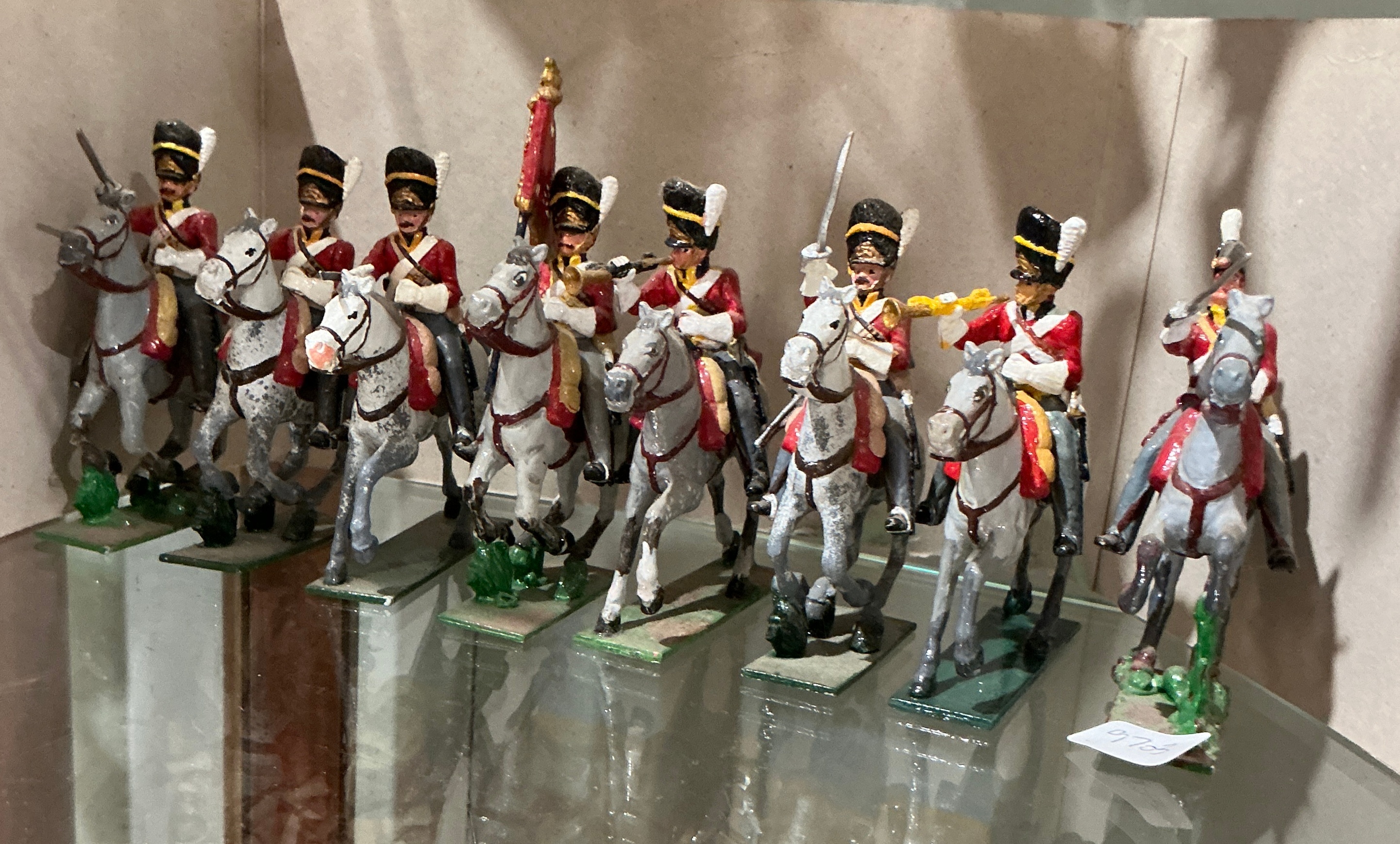 A set of hand-painted, cast-metal miniature figures representing British light cavalry from the Napoleonic Wars. These figures are produced in the traditional style of mid-20th-century toy soldier manufacturers. The riders are depicted in red dolman-style tunics featuring white and yellow braided ornamentation, white breeches, and tall black cylindrical shakos with white plumes. The horses are painted in various shades of grey and white. The collection includes a standard-bearer with a red guidon and several troopers with drawn sabres. All figures are mounted on integral rectangular bases finished in green paint. A small adhesive label with the handwritten notation 6/6 is visible on one base. No manufacturer marks are clearly visible on the undersides of the bases.