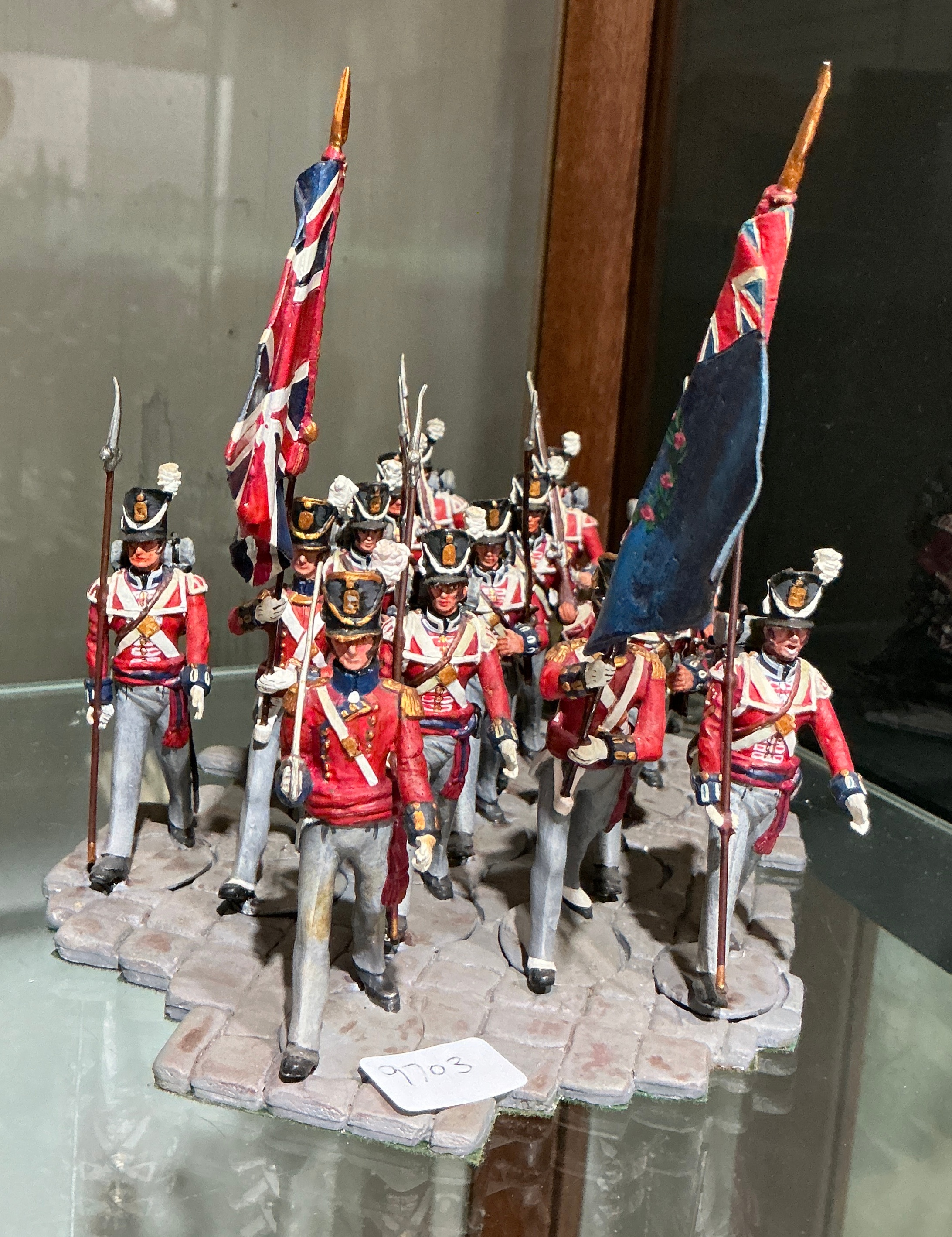 A set of high-quality, hand-painted military miniatures depicting a British Army infantry regiment from the Napoleonic Wars period, circa 1812-1815. The figures are presented in a close-order marching formation on a textured diorama base representing a cobbled street. The group includes Ensigns carrying the King’s Colour (Union Flag) and a blue Regimental Colour, suggesting a Royal regiment such as the 1st Foot Guards. The contingent features officers and non-commissioned officers armed with swords and spontoons, alongside rank-and-file soldiers. All figures wear red coatees with blue facings, white crossbelts, grey trousers, and Belgic style shakos with decorative plates and plumes. The figures are professionally cast and finished with a matte paint. A white adhesive label with the handwritten number 9703 is present on the side of the base.
