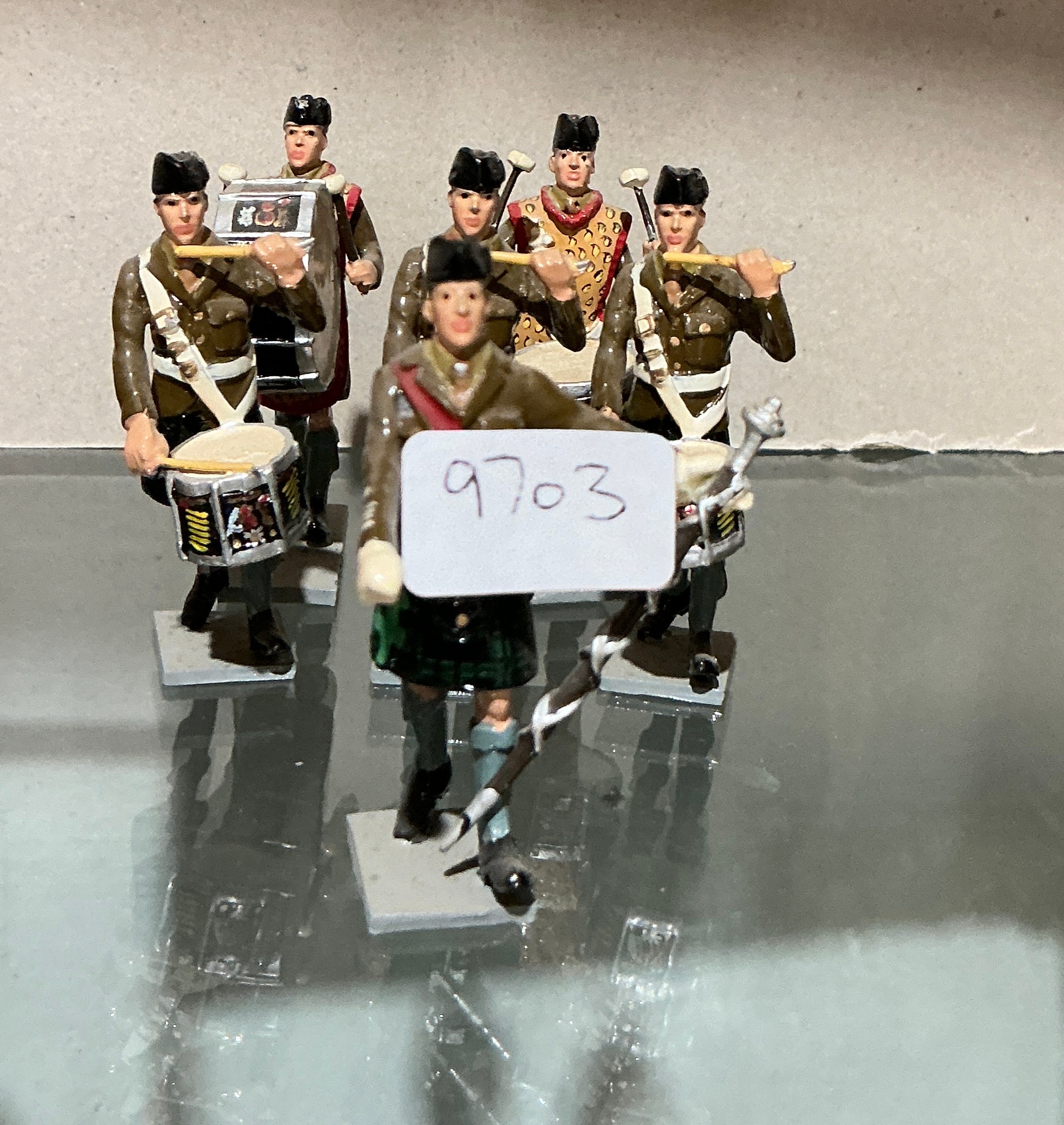 A set of cast metal miniature toy soldiers representing a Scottish regimental band in service dress. The figures are hand-painted and mounted on two white rectangular display bases. The collection includes a Drum Major holding a silver-coloured mace and drummers depicted in kilts, khaki tunics, and leopard-skin or tiger-skin aprons. All figures wear glengarry headgear. A paper label with the handwritten number 9703 is affixed to one figure. No other maker marks or stamps are visible on the exterior surfaces or bases. The figures are rendered in the style of traditional British toy soldier manufacturers.