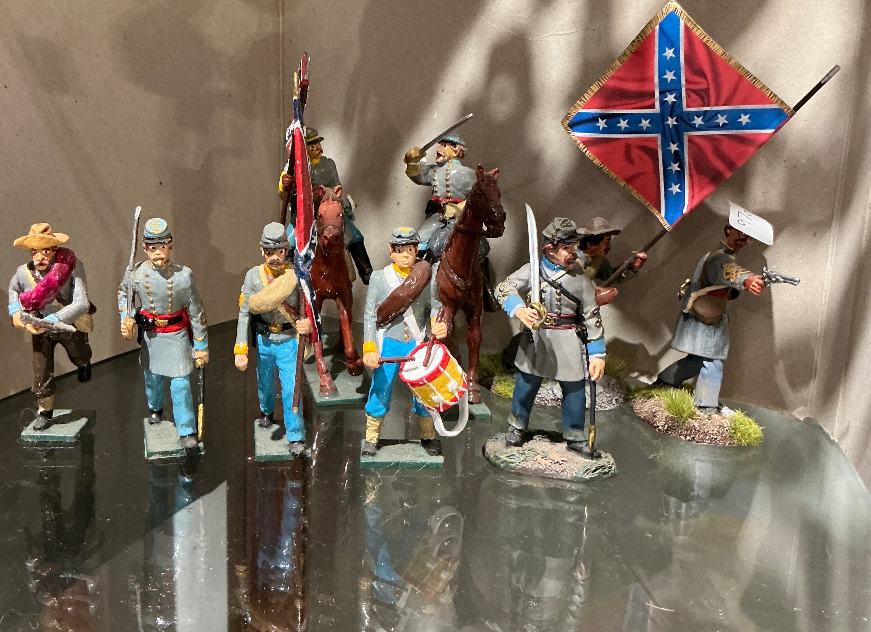 A collection of hand-painted cast metal military miniatures depicting Confederate States of America (CSA) troops from the American Civil War. The group comprises several figures in various roles, including a standard bearer with a fringed battle flag, two mounted cavalry troopers on bay horses, a drummer, and several infantrymen, including one officer with a drawn sabre. The figures are crafted in the traditional 54mm scale, characteristic of makers such as W. Britain or Tradition. They are finished in a semi-gloss paint and mounted on integral bases. A small adhesive tag marked 26 is present on the headgear of one figure.