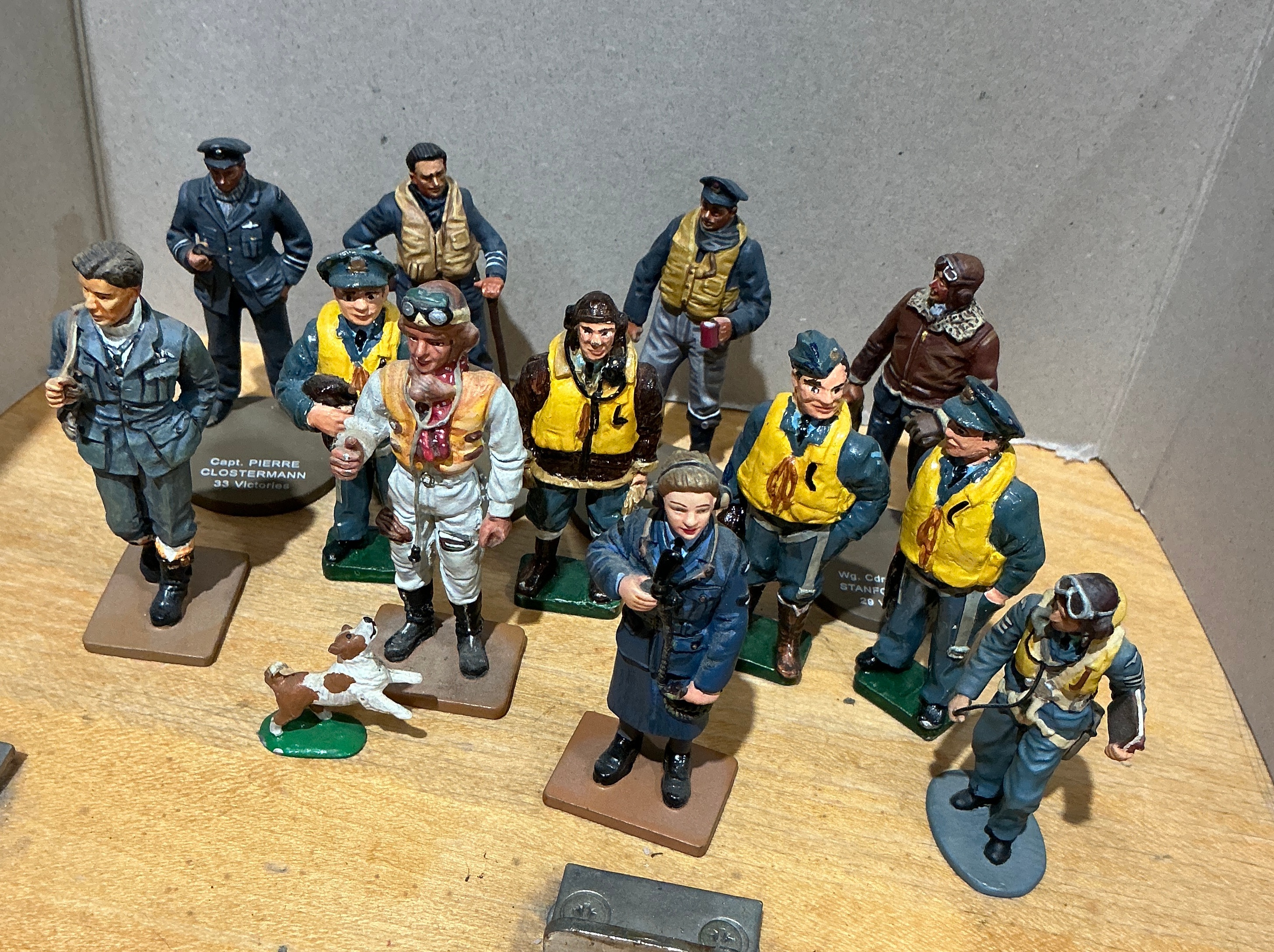 A collection of hand-painted cast metal miniature figures by King and Country, depicting various Allied aircrew and pilots from the Second World War. The set includes eleven human figures and one canine figure. Notable identifiable figures include the Free French ace Captain Pierre Clostermann, marked on a circular grey base, and Wing Commander Robert Stanford Tuck, identified by a partial mark on a rectangular green base. The figures are depicted in a variety of period-correct attire, including sheepskin flying jackets, life vests known as Mae Wests, and standard service dress uniforms representing the Royal Air Force, United States Army Air Forces, and the Free French Air Force. The lot also includes several separate rectangular metal bases.