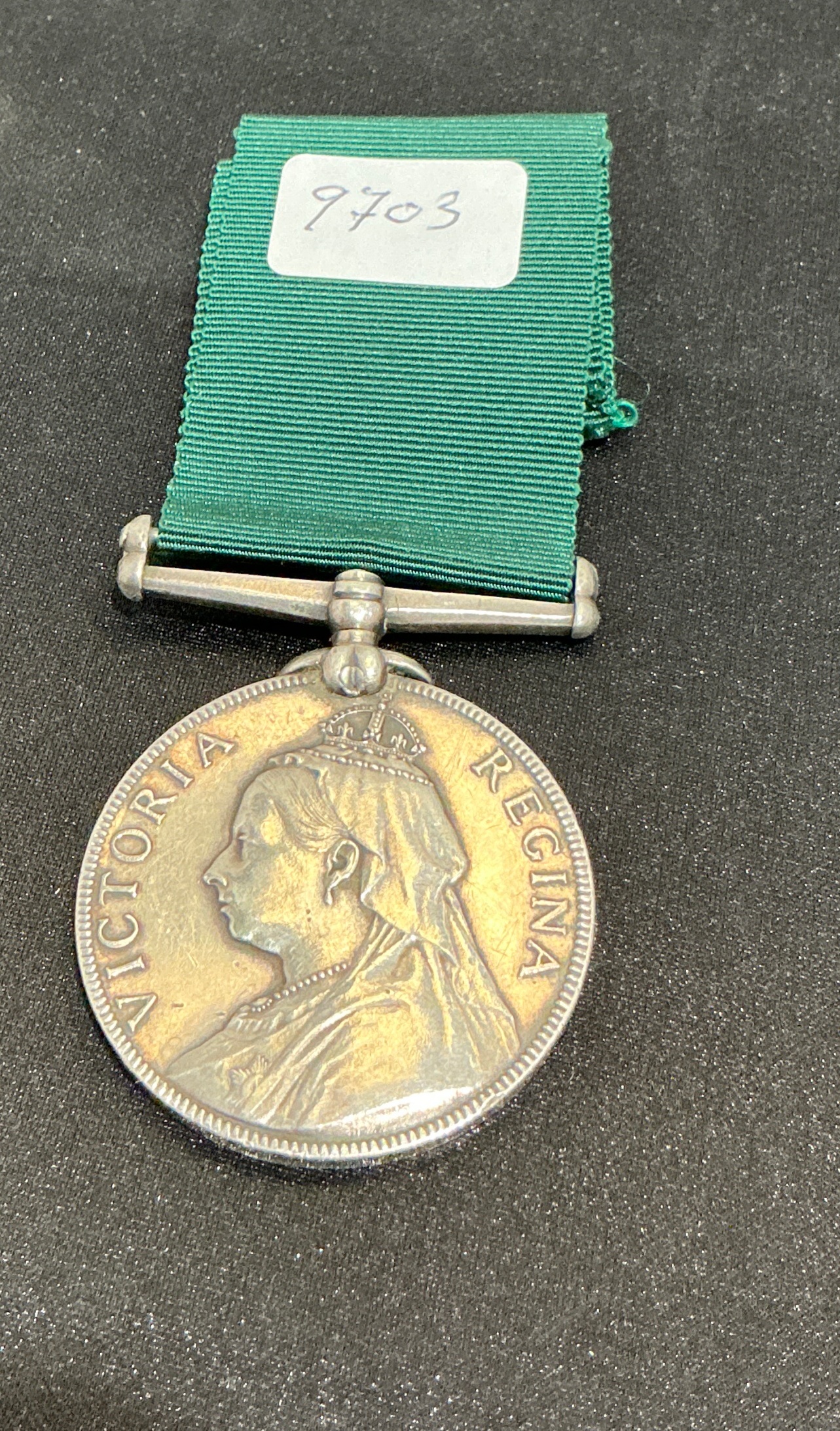 A silver Volunteer Force Long Service Medal, which was established in 1894 to recognise twenty years of efficient service in the Volunteer Force. The obverse features the crowned and diademed bust of Queen Victoria facing left, with the surrounding inscription VICTORIA REGINA. The reverse shows an oak leaf wreath encircling the words FOR LONG SERVICE IN THE VOLUNTEER FORCE arranged on three scrolls. The medal is attached to a swivel bar suspension and retains a plain dark green grosgrain ribbon. A small paper tag with the handwritten number 9703 is attached to the ribbon. No naming is clearly visible on the rim in the provided photographs.