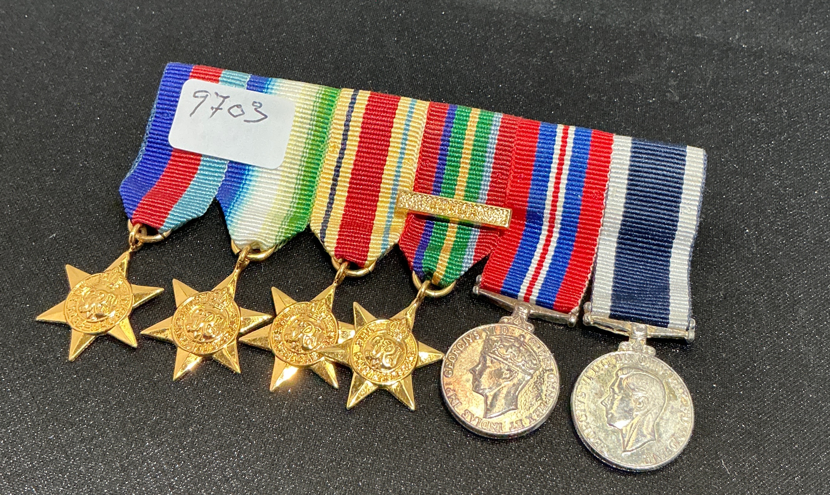 A group of British miniature medals from the Second World War, swing-mounted on a metal brooch bar for formal evening wear. The group comprises four bronze six-pointed stars and two circular medals. The stars are identified as the 1939-1945 Star, the Africa Star, the Italy Star, and the France and Germany Star. The Africa Star is fitted with a miniature clasp bearing the inscription NORTH AFRICA 1942-43. The circular medals consist of the Defence Medal and the War Medal 1939-1945. The obverse of the circular medals features the profile of King George VI with the circumscription GEORGIVS VI D: G: BR: OMN: REX ET INDIAE IMP. The medals are suspended from their respective silk ribbons, which are arranged in the official order of wear. The reverse of the mounting bar features a standard pin and hook fastening. A small white adhesive label with the handwritten number 9703 is present on the reverse of the first ribbon.