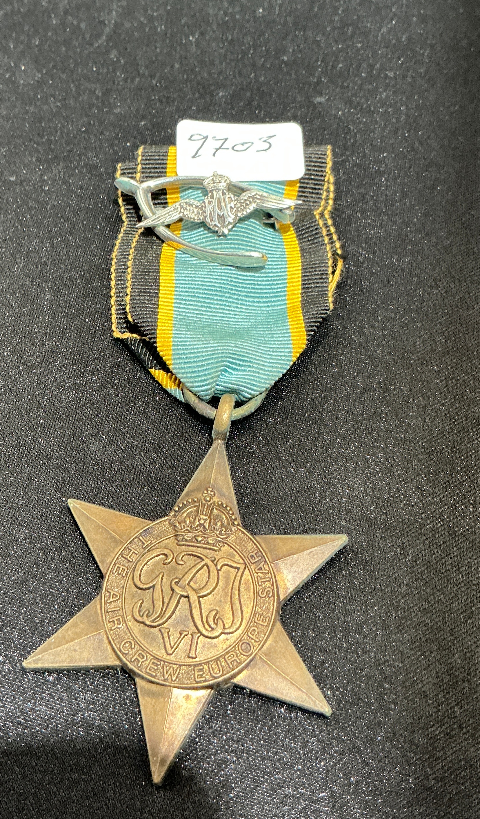 This is a British Second World War campaign medal known as the Air Crew Europe Star. The award is a six-pointed bronze star. The obverse features the Royal Cypher of King George VI, GRI VI, surmounted by a crown and surrounded by a circular band inscribed THE AIR CREW EUROPE STAR. The reverse of the medal is plain and unnamed, as is standard for British issues of this period. The medal is suspended from its original silk ribbon which consists of a wide light blue centre band flanked by narrow yellow stripes and wide black borders. Attached to the ribbon is a silver-toned badge depicting the Royal Air Force insignia of an eagle in flight surmounted by a crown, which appears to be a private addition or sweetheart badge. A small paper tag is attached to the ribbon with the handwritten number 9703.