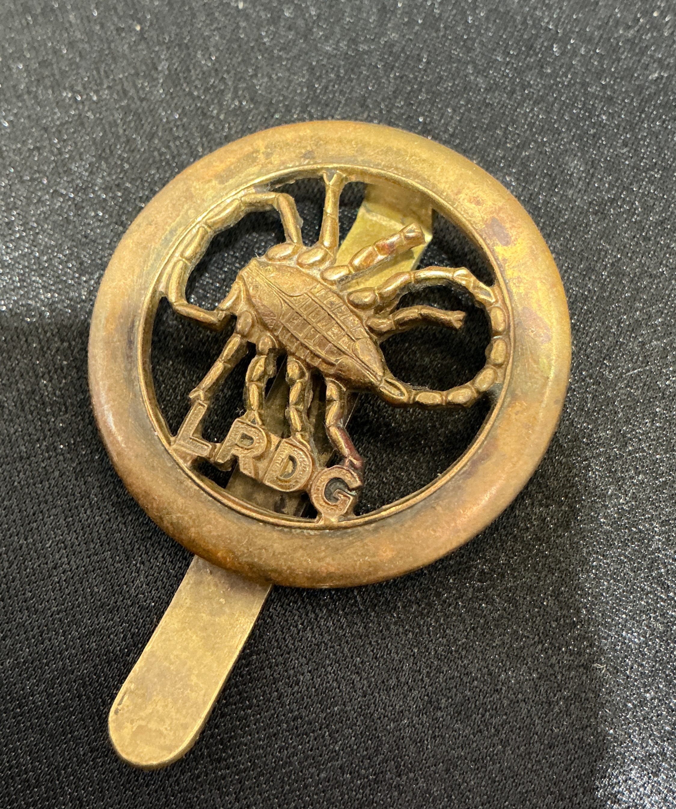 A British Army brass cap badge for the Long Range Desert Group (LRDG), a specialist reconnaissance and raiding unit active during the North African Campaign of the Second World War. The badge is of circular open-work construction, featuring a central raised scorpion above the unit initials LRDG. The reverse is fitted with a standard vertical brass slider for attachment to a beret or cap. The slider is stamped with the maker’s mark WAD, identifying the manufacturer as W.A. Dowler and Sons.