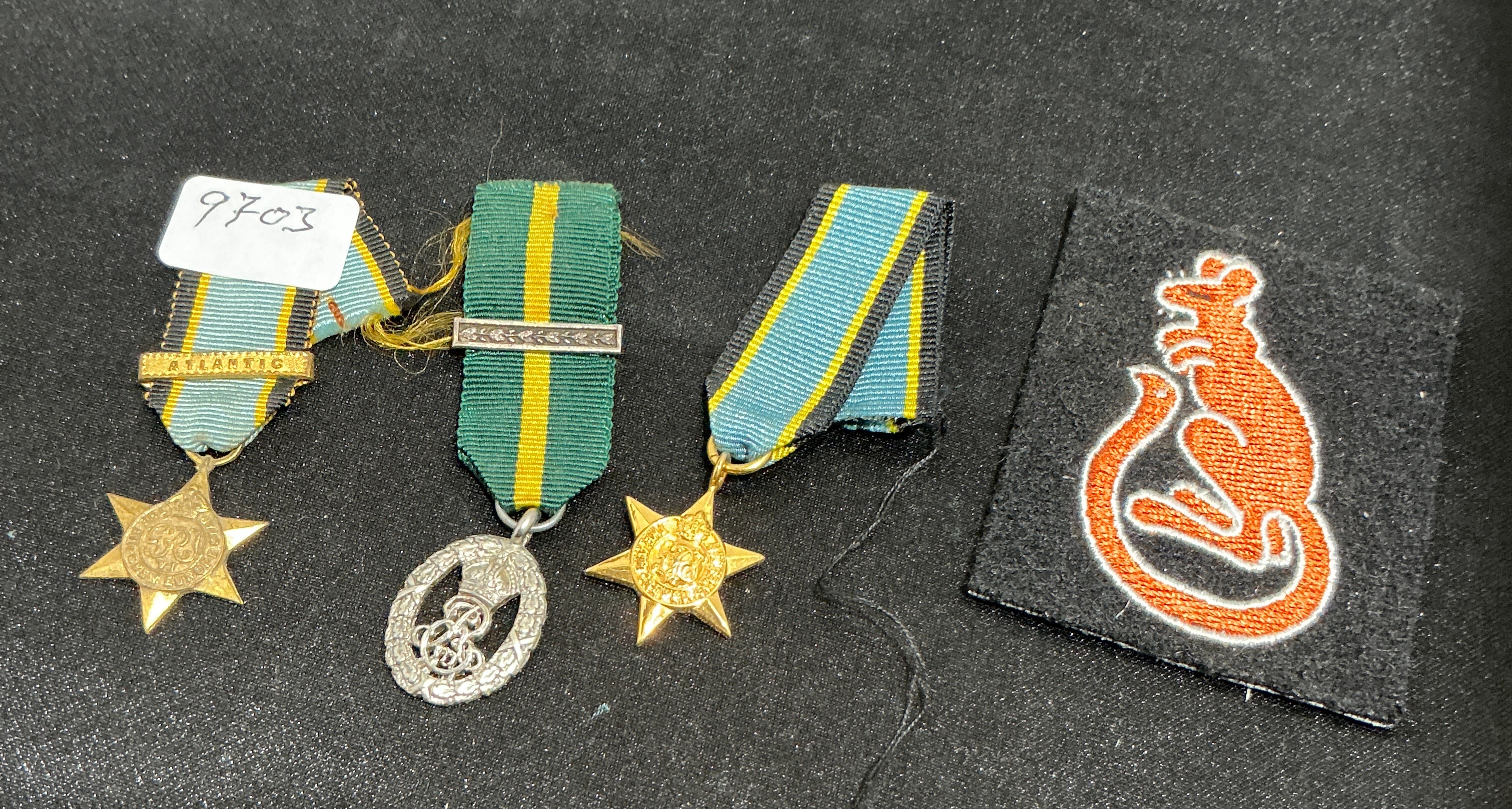 An assortment of British military awards and insignia from the Second World War period. The collection includes a cloth formation sign for the 7th Armoured Division, known as the Desert Rats, featuring an embroidered orange jerboa on a black rectangular background. The medals include an Air Crew Europe Star, being a bronze six-pointed star with the Royal Cypher of King George VI (GRI VI) at the centre, suspended from a ribbon of light blue with black and yellow edges. Also present is an Atlantic Star, a bronze six-pointed star with a Royal Cypher, suspended from a watered silk ribbon with shaded stripes of blue, white, and sea-green; this medal is fitted with a silver-coloured clasp embossed with the word ATLANTIC. The grouping further includes an oval silver-coloured Efficiency Medal (Territorial) featuring the Royal Cypher of King George VI (GRI VI) on the obverse, suspended from a green ribbon with yellow borders and fitted with a silver-coloured territorial clasp. A small white paper tag with the handwritten number 9703 is attached to the Atlantic Star.