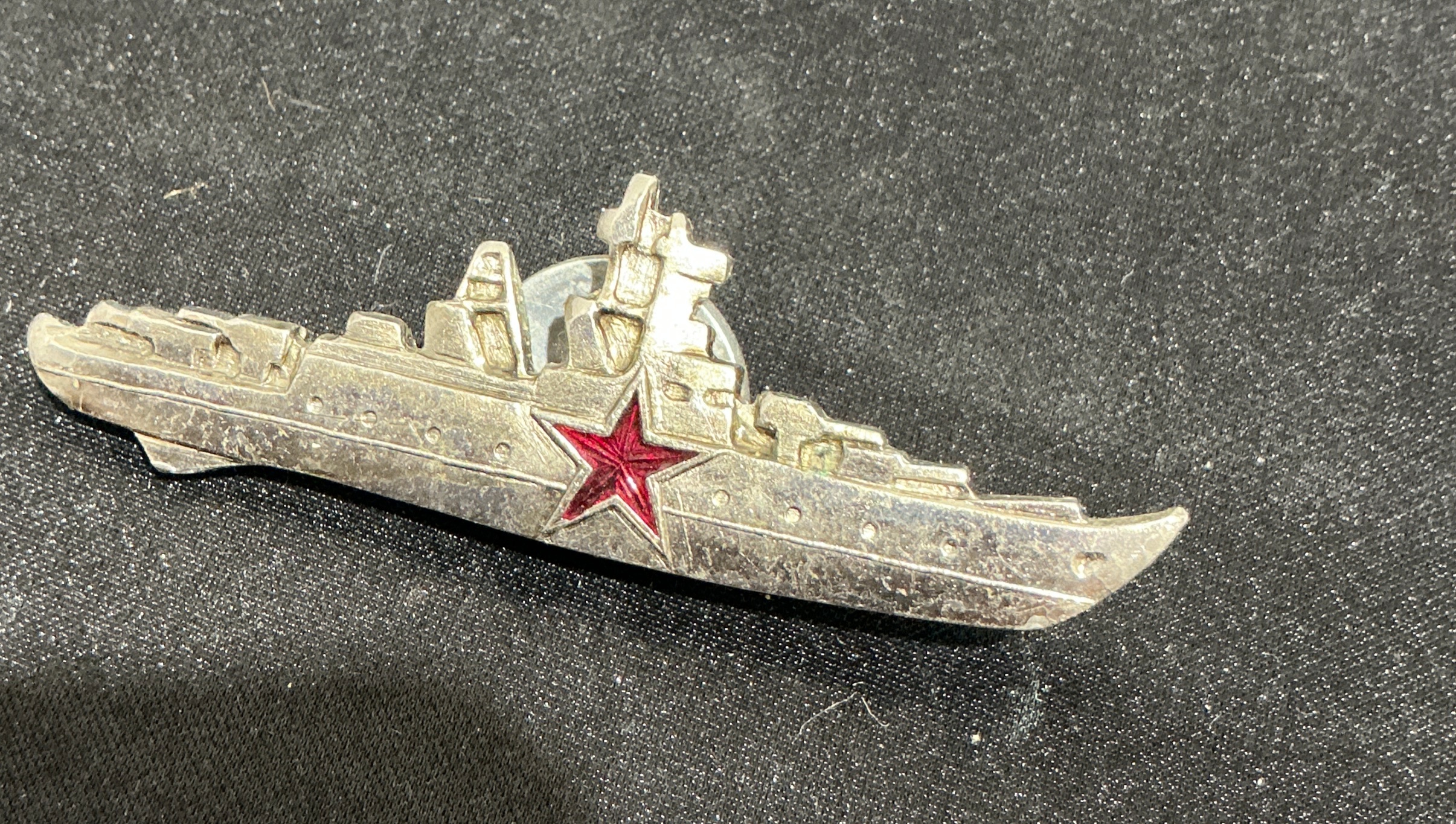 A Soviet Navy (VMF) officer’s badge for a Commander of a Surface Ship (Komandir Korablya). The badge is struck in silver-toned metal and features the profile of a Soviet cruiser with a red enamel five-pointed star on the hull. It utilises a screw-back fastening mechanism. The original circular nut is present and bears the Cyrillic maker’s mark for the Leningrad Mint (Leningradskiy Monetny Dvor). This insignia was introduced in the late 1980s for commanding officers of surface vessels.