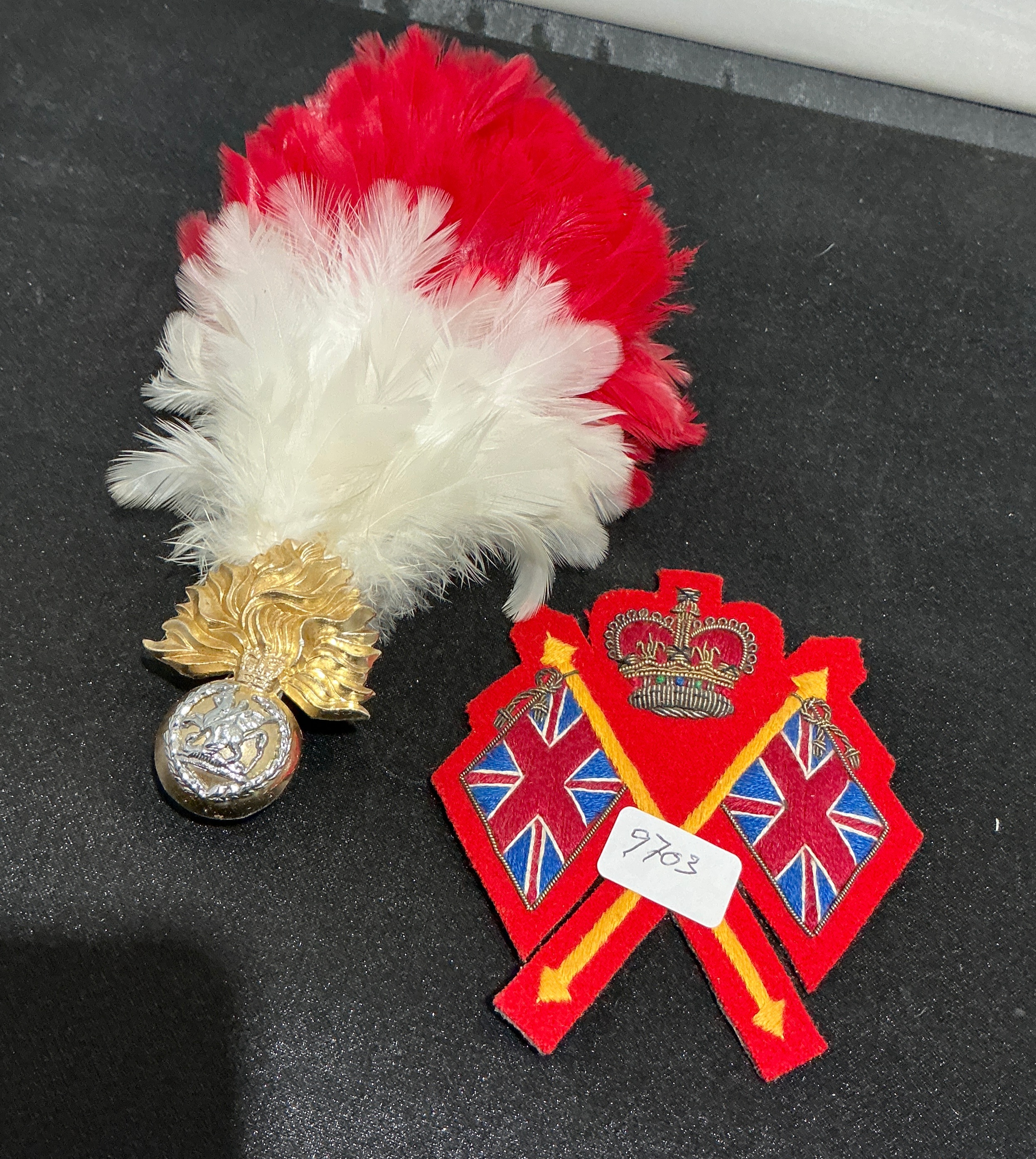This lot comprises two distinct pieces of British Army uniform insignia. The first item is a Royal Regiment of Fusiliers cap badge, featuring a bi-metal construction with a gilt-finished flaming grenade and a silvered central device depicting St. George slaying the dragon within a garter. The badge is mounted at the base of a traditional bi-colour feather hackle, consisting of a red upper section over a white lower section. The second item is a Drum Major’s appointment badge, typically worn on the sleeve. This large badge is heavily embroidered in multi-coloured silks on a shaped red felt background, depicting two crossed Union Flags on yellow poles surmounted by a St. Edward’s Crown. A white adhesive inventory label marked 9703 is attached to the front of the embroidered badge.