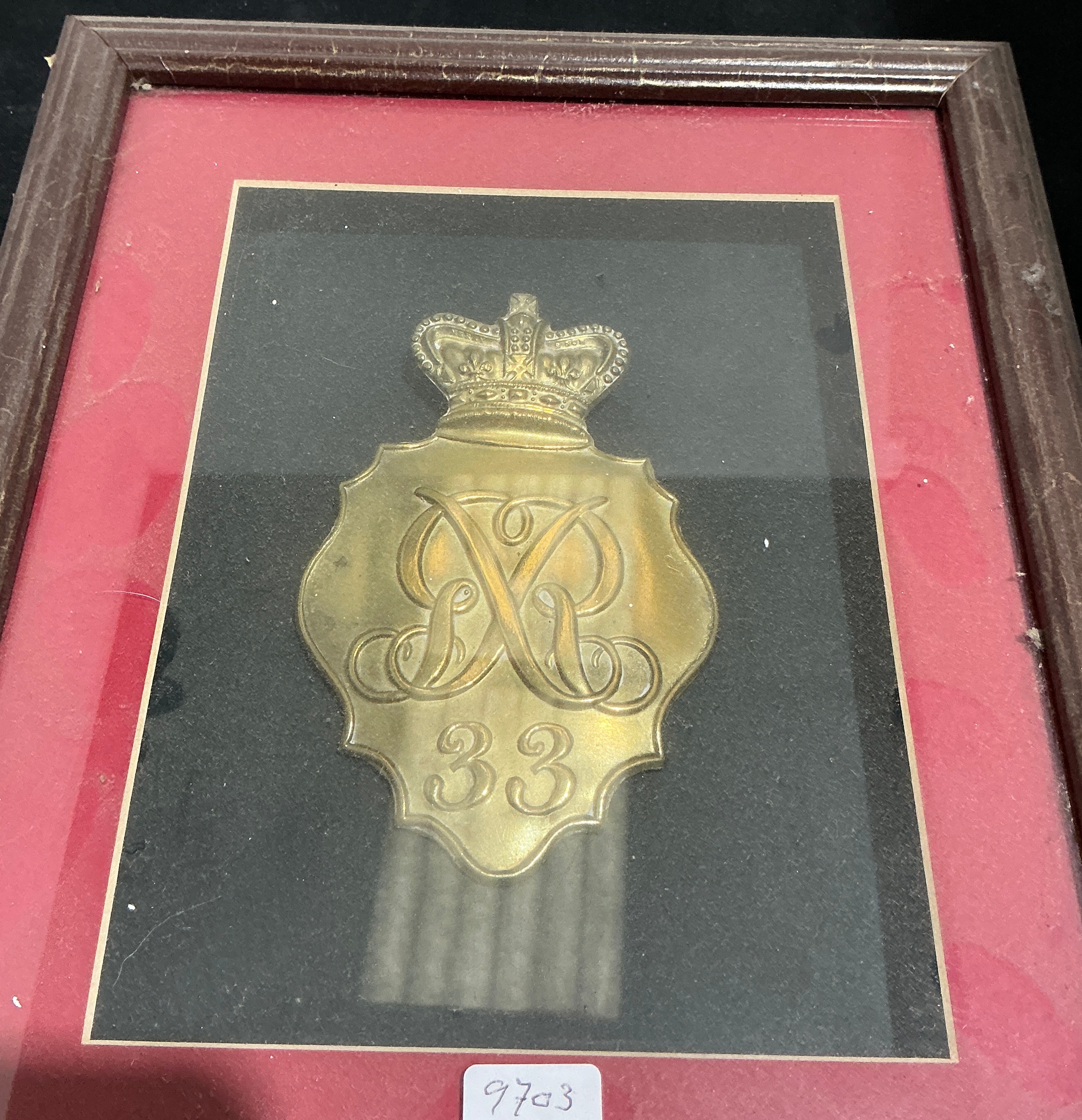 A British Army 1812 Pattern ‘Belgic’ shako plate, specifically attributed to the 33rd (The 1st Yorkshire West Riding) Regiment of Foot. The plate is manufactured from die-struck brass in the characteristic tombstone or cartouche shape. It is surmounted by a royal crown above the central field, which features the intertwined script cypher GR for King George III. The regimental numerals 33 are embossed at the lower right corner. This specific pattern of headgear plate was worn by British line infantry during the late Napoleonic Wars, including the Peninsular campaign and the Battle of Waterloo in 1815. The piece is professionally presented in a dark stained wooden frame with a double mount of red and black. A small white label with the handwritten reference number 9703 is attached to the glass.