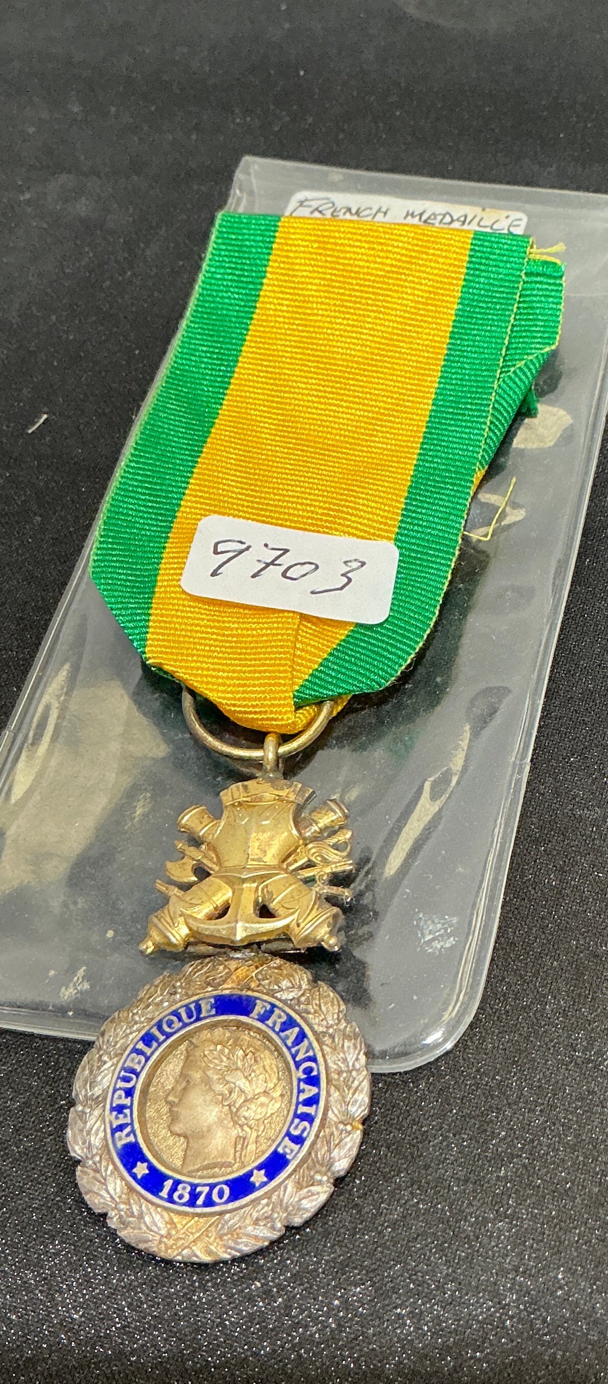 A French Third Republic Médaille Militaire (Military Medal). This award consists of a circular silver-toned laurel wreath encircling a central gold-toned medallion. The obverse depicts the profile of Ceres, the personification of the French Republic, within a blue enamel border inscribed REPUBLIQUE FRANCAISE 1870. The reverse features a central field inscribed VALEUR ET DISCIPLINE. The medal is suspended from a metal trophy of arms device comprising a cuirass over crossed cannons, axes, and a sword. It is fitted with its original yellow silk ribbon featuring green borders. The item is presented in a clear plastic sleeve with a handwritten label reading FRENCH MEDAILLE MILITAIRE and an adhesive tag numbered 9703.