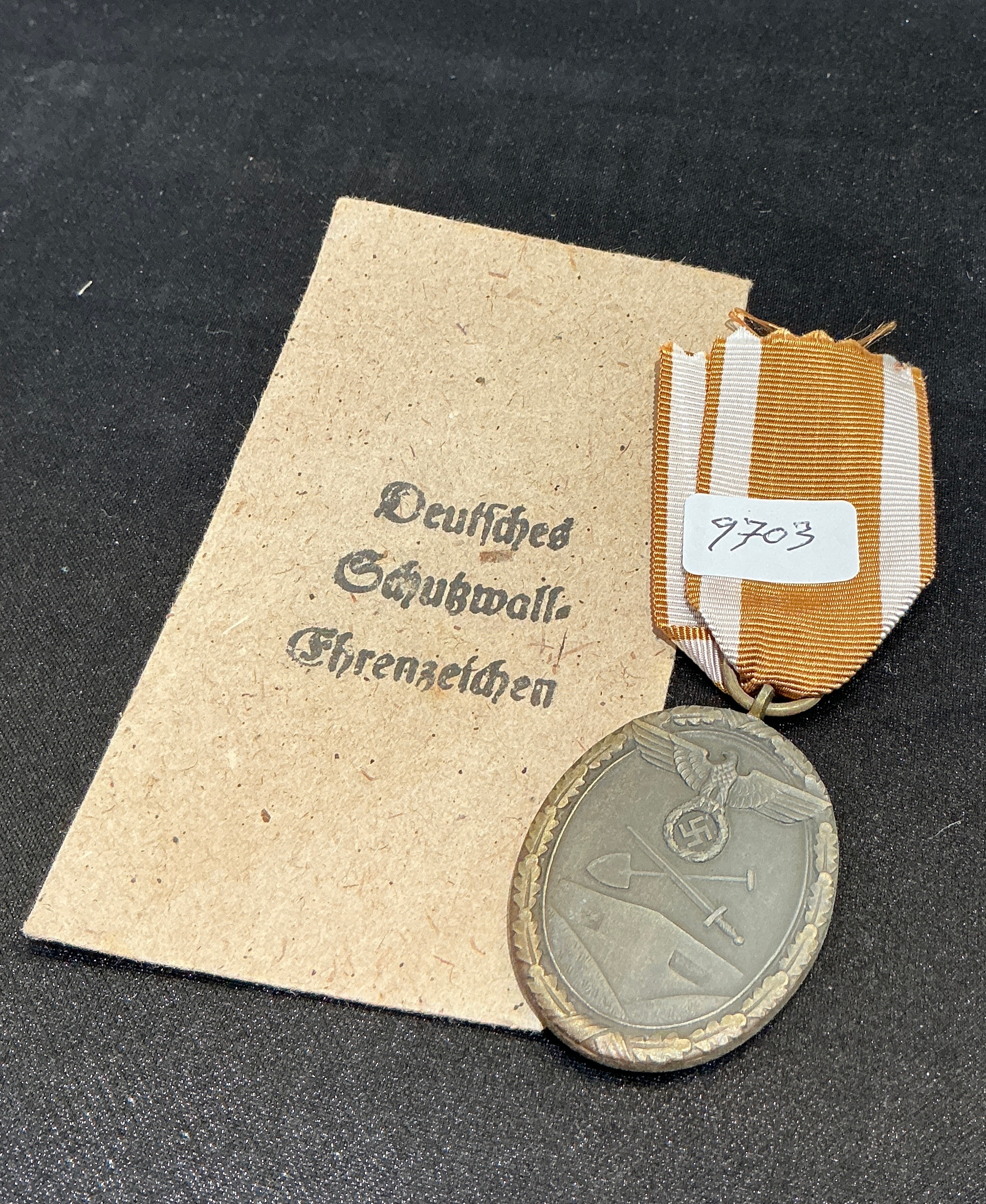 A German West Wall Medal (Deutsches Schutzwall-Ehrenzeichen), a commemorative award established in 1939 for military and civilian personnel involved in the construction and manning of the western border fortifications. The oval medal is struck in a zinc-based alloy (Kriegsmetall) and originally featured a bronzed finish, of which traces remain in the recessed areas. The obverse displays the national eagle with outspread wings clutching a wreathed swastika, positioned over a crossed shovel and sword, all contained within an oak leaf border. The reverse bears the inscription FÜR ARBEIT ZUM SCHUTZE DEUTSCHLANDS (For work for the protection of Germany) set within a corresponding oak leaf wreath. The medal is suspended from its original golden-brown ribbon which features two narrow white stripes towards each edge. Accompanying the medal is a fragment of the original buff-coloured paper presentation packet, printed in black Fraktur script with the award title. A small white collection label with the handwritten number 9703 is adhered to the ribbon.