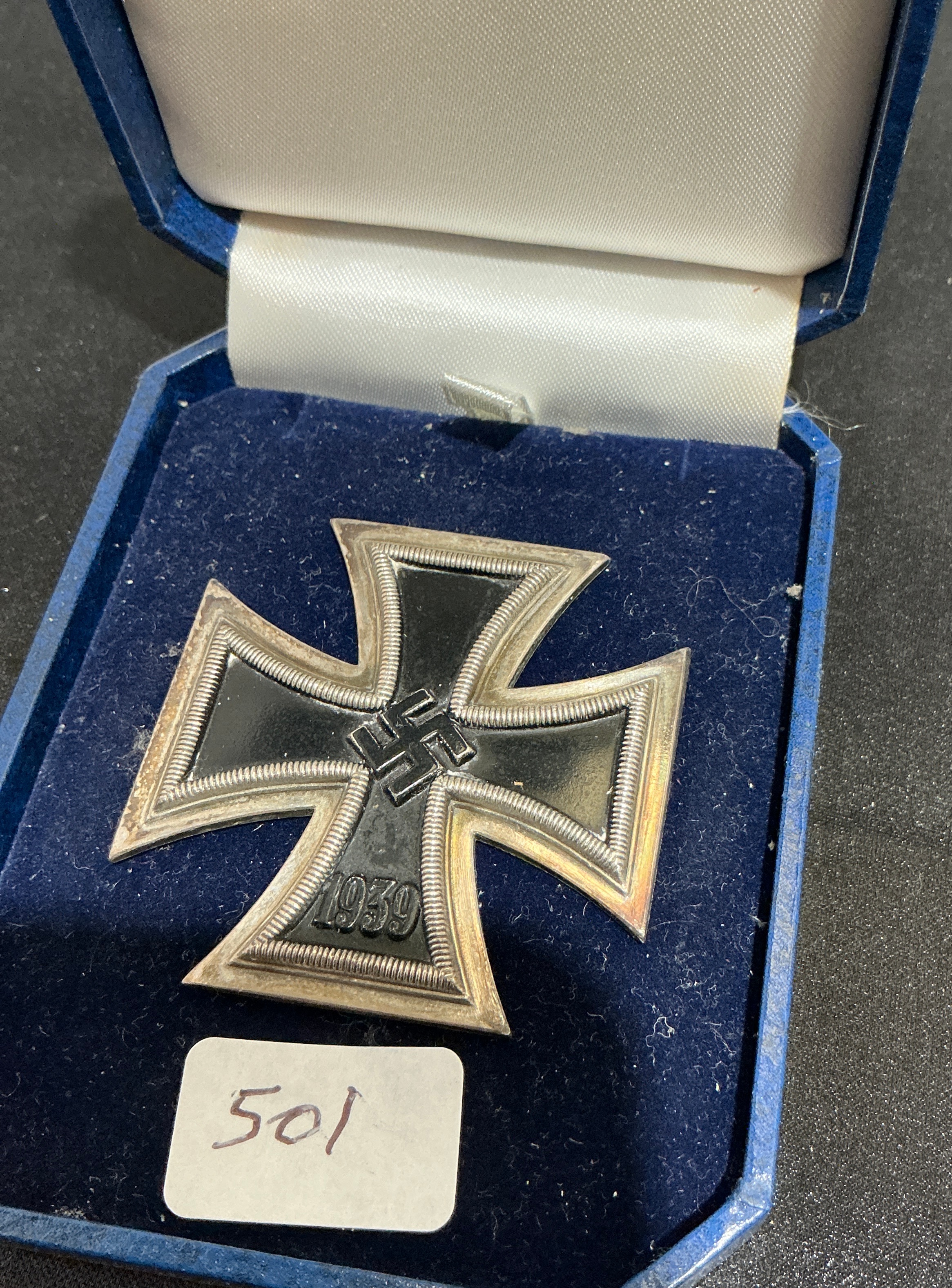 A 1939 Iron Cross 1st Class (Eisernes Kreuz 1. Klasse) manufactured by Deschler & Sohn, München. The award features a standard three-piece construction, consisting of a black-finished magnetic core sandwiched between two silvered frame halves. The obverse centre displays a raised swastika and the date 1939 at the base of the lower arm. The reverse is a flat, silvered surface equipped with a vertical pin and catch for uniform attachment. The reverse of the attachment pin is stamped with the numeral 1 inside a square border, identifying the manufacturer as Deschler & Sohn. The medal is presented in a modern blue velvet-lined display case.