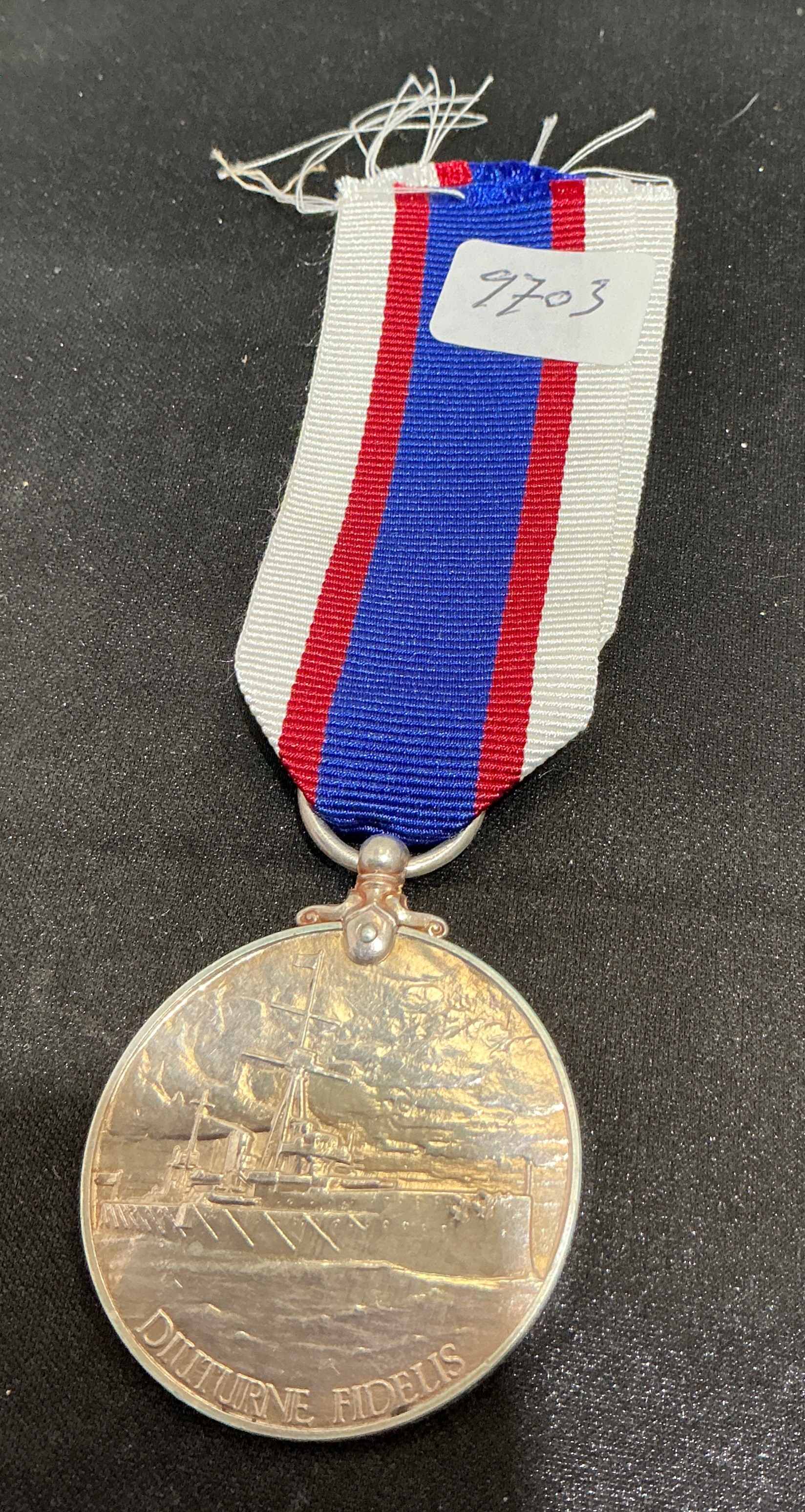 A United Kingdom Royal Fleet Reserve Long Service and Good Conduct Medal, George VI issue. The silver medal features the coinage-style effigy of King George VI on the obverse, facing left, with the legend GEORGIVS VI D:G:BR:OMN:REX ET INDIAE IMP:. The reverse depicts a battleship at sea with a harbour wall in the background and the Latin motto DIUTURNE FIDELIS to the right. The medal is fitted with its original silk ribbon, which consists of a broad blue central stripe flanked by narrow red stripes and white edges. The rim is officially impressed with the recipient’s details: J. 33361 (CDE V. B. 14375) G. MORGAN. A. B. R. F. R. This indicates the medal was awarded to G. Morgan, who served as an Able Seaman (A.B.) in the Royal Fleet Reserve (R.F.R.). The INDIAE IMP title in the legend dates this specific strike to the period between 1936 and 1948.