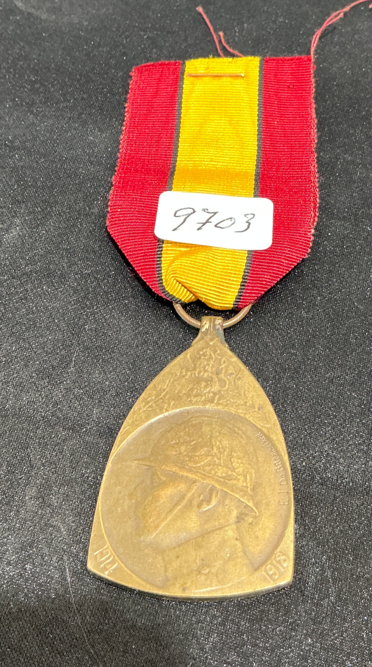 A Belgian Commemorative Medal of the 1914-1918 War, struck in bronze and designed by Eugene Jean de Bremaecker. The medal is shield-shaped with a curved base. The obverse features the right-facing profile of a Belgian soldier wearing an Adrian helmet, flanked by the dates 1914 and 1918 in the lower corners. It is signed E. J. DE BREMAECKER along the upper left edge. The reverse carries a bilingual inscription in French and Dutch: MEDAILLE COMMEMORATIVE DE LA CAMPAGNE 1914-1918 and HERINNERINGSMEDAILLE VAN DEN VELDTOCHT 1914-1918. This text is surmounted by a royal crown and flanked by laurel branches. The medal is suspended from its original moire silk ribbon in the Belgian national colours of red with a wide central yellow stripe.