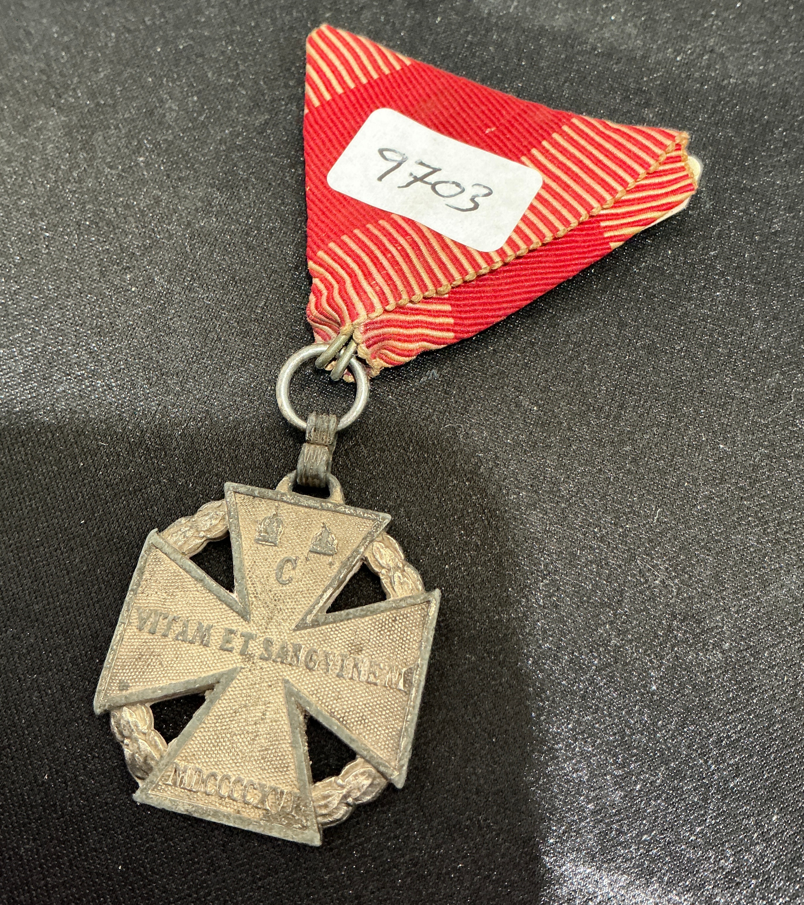 This is an original Austro-Hungarian Karl Troop Cross (Karl-Truppenkreuz), a combat decoration established by Emperor Karl I on 13 December 1916. The medal is struck in a zinc-based alloy, commonly referred to as Kriegsmetall, which was characteristic of late-war production. The design comprises a cross pattee set within a circular laurel wreath. It is suspended from its original triangular ribbon (Dreiecksband) in red with narrow horizontal white-and-red striped edges. The obverse features the Latin inscription GRATI PRINCEPS ET PATRIA across the vertical arms and CAROLVS IMP ET REX across the horizontal arms. The reverse displays the Austrian Imperial Crown and the Hungarian Royal Crown positioned above the personal cipher C for Emperor Karl I. The horizontal arms on the reverse bear the text VITAM ET SANGVINEM, while the lower arm is dated with the Roman numerals MDCCCCXVI for 1916.